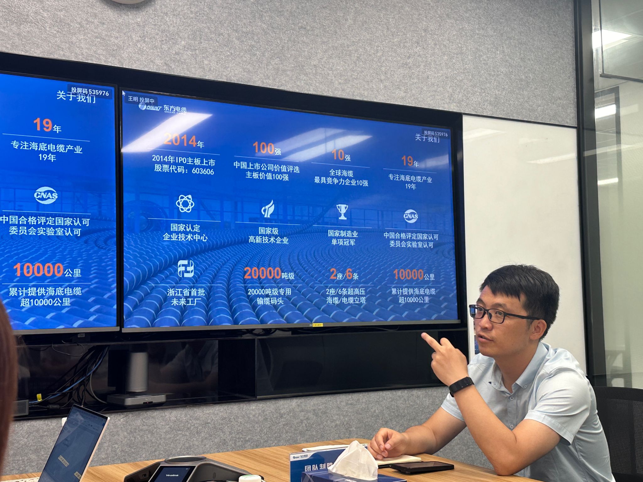 7月20日,调研团队一行受到了东方电缆副总裁兼财务总监柯军、财务部王经理和研发部刘经理的热情接待。此次调研让团队的成员们对工业自动化和电力传输领域有了更深入的了解。车间内智能化生产线高效运转,从精密的部件组装到严格的质量控制,从生产到装运、从车间到码头的智能化联动,每一个环节都彰显出数字化应用的成效,展现了“未来工厂”的真实面貌。