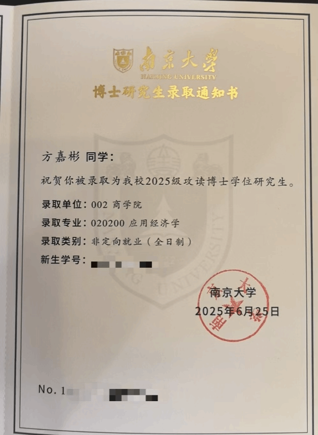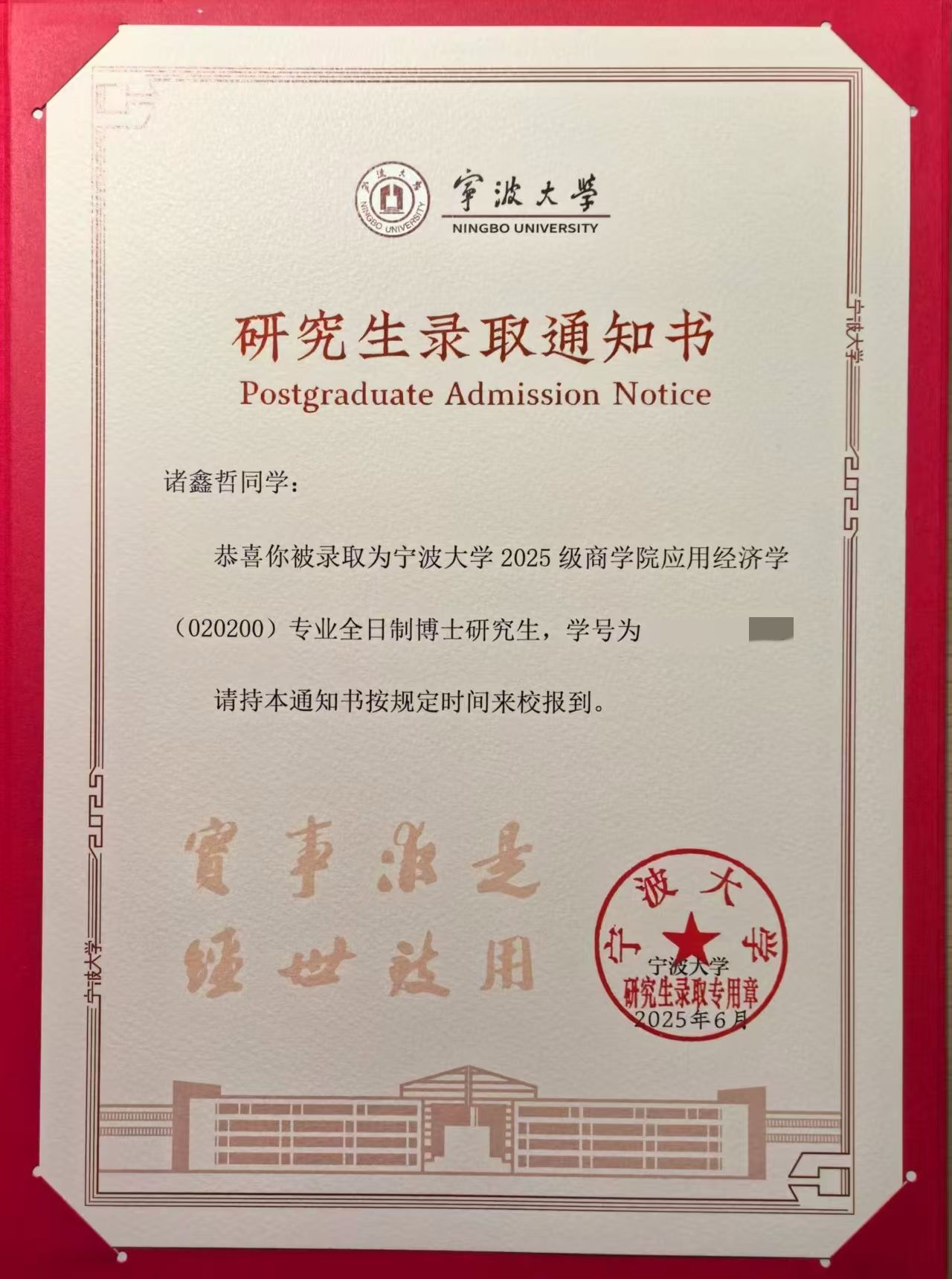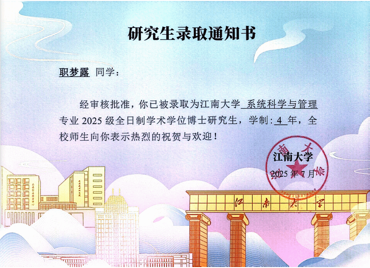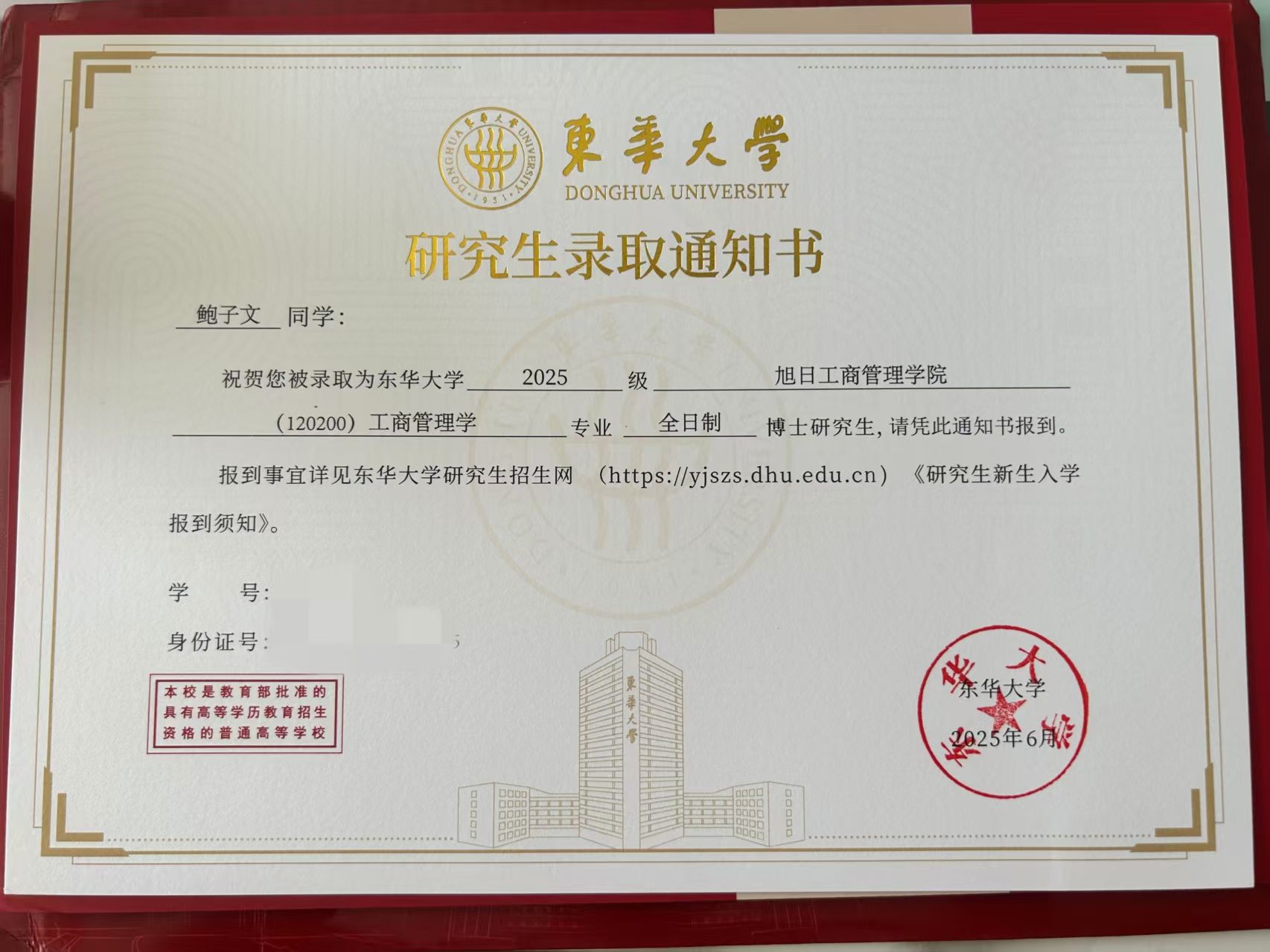 应用经济学专业录取,鲍子文进入东华大学工商管理学专业深造,职梦露录取至江南大学系统科学与管理专业。
