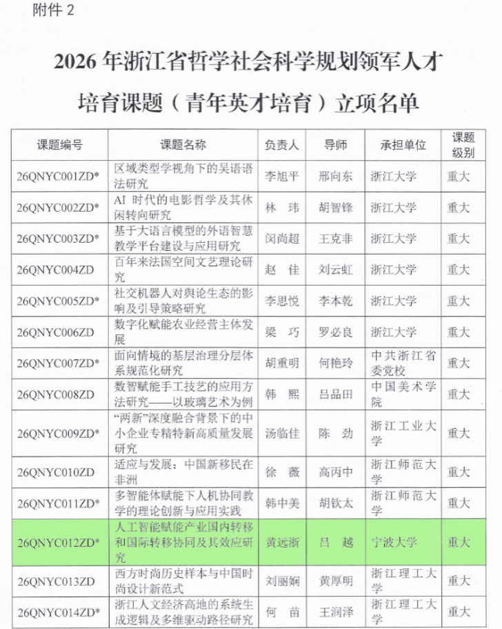 近日,浙江省社科联公布了2026年浙江省哲学社会科学规划领军人才培育专项课题立项名单。我校MIB学位点黄远浙教授主持申报的《人工智能赋能产业国内转移和国际转移协同及其效应研究》获2026年浙江省哲学社会科学规划领军人才培育课题(青年英才培育)重大项目(26QNYC012ZD)。