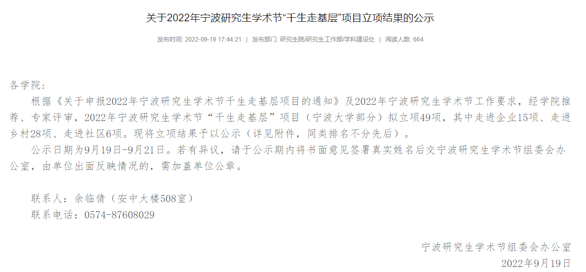 根据《关于申报2022年宁波研究生学术节千生走基层项目的通知》及2022年宁波研究生学术节工作要求,经学院推荐、专家评审,2022年宁波研究生学术节“千生走基层”项目(糖心视频