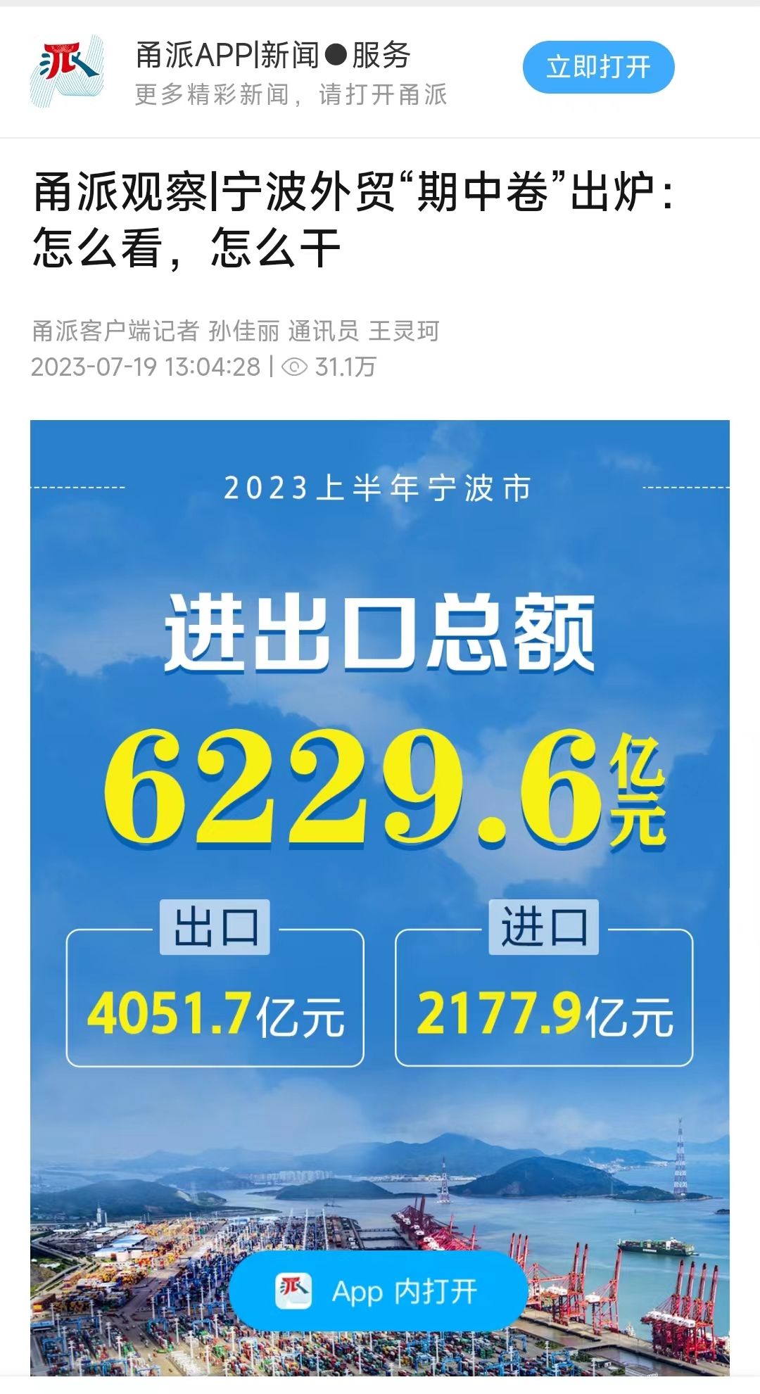 7月19日,宁波外贸“期中卷”揭晓。据宁波海关统计,今年上半年,宁波进出口额超6200亿元。其中,出口额超4000亿元,进口额近2200亿元。从数据看,进出口额、出口额以及进口额均同比微降,宁波外贸稳增长面临较大压力。