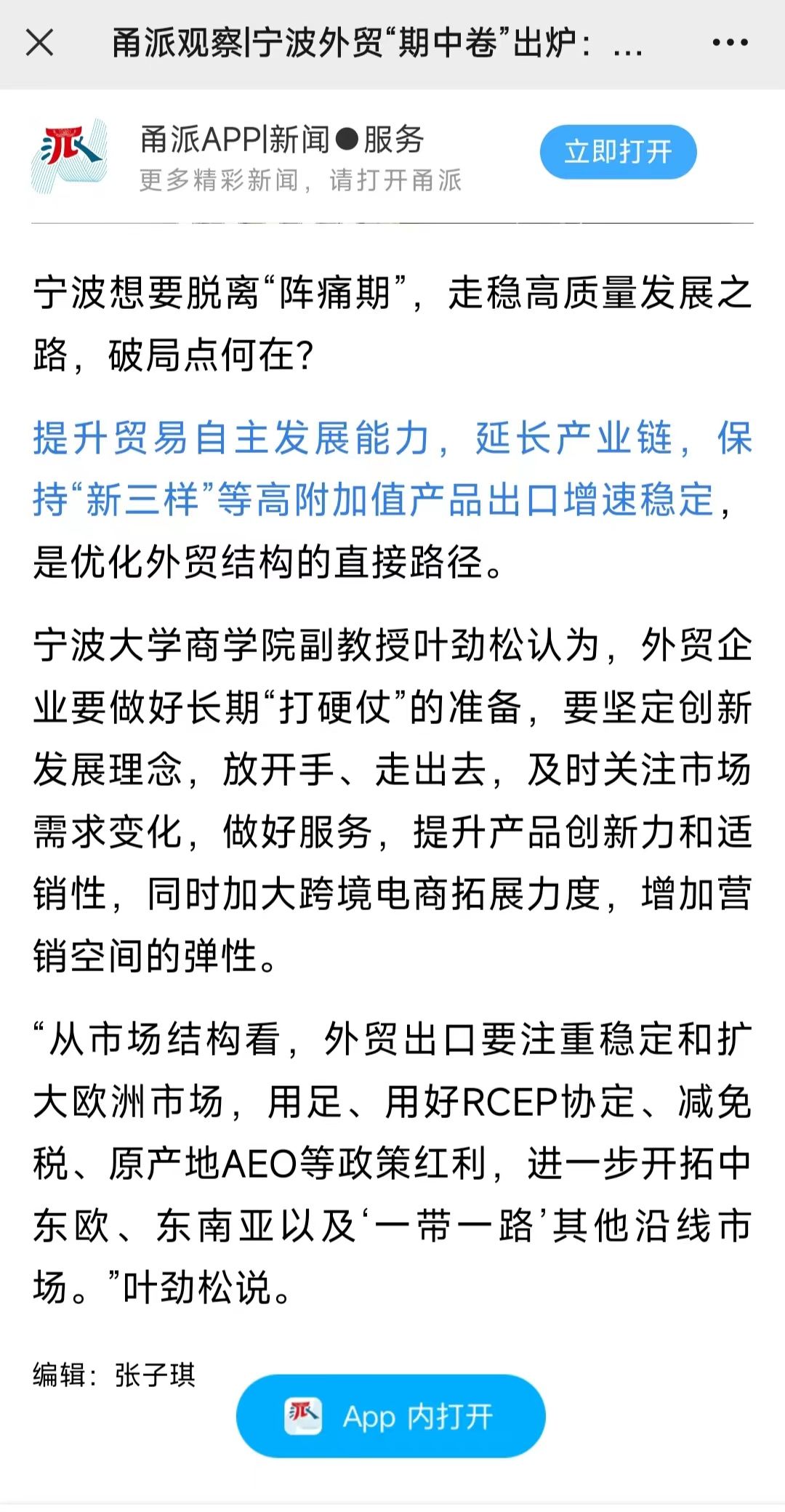 宁波想要脱离“阵痛期”,走稳高质量发展之路,破局点何在?我校MIB专业专职教师叶劲松在接受甬派记者孙佳丽采访时指出,提升贸易自主发展能力,延长产业链,保持“新三样”等高附加值产品出口增速稳定,是优化外贸结构的直接路径。