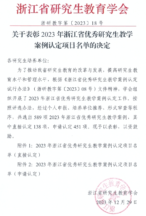 日前,浙江省研究生教育学会发布了《关于表彰2023年浙江省优秀研究生教学案例认定名单的决定》,我校MIB学位点师生撰写的两篇案例获得认定,特此祝贺!