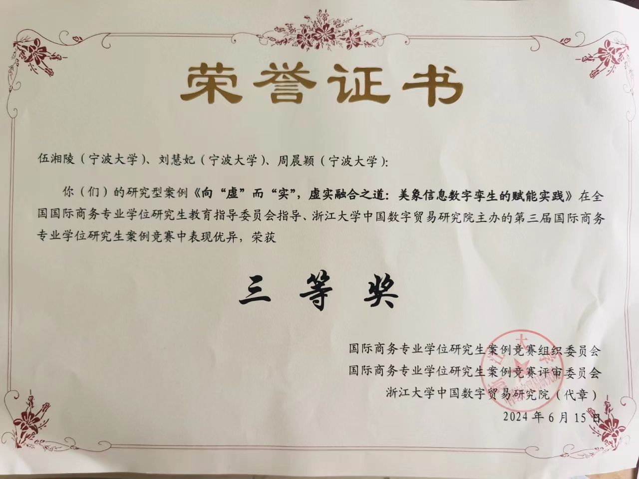 在此次案例评选活动中,我校MIB专职导师伍湘陵与研究生周晨颖(2023MIB)、刘慧妃(2023应用经济学)撰写的案例《向“实”而“虚”,实虚融合之道:宁波中集智能制造的数字化跃升》获评教学型案例三等奖,《向“虚”“实”,虚实融合之道:美象信息数字孪生的赋能实践》获评研究型案例三等奖。
