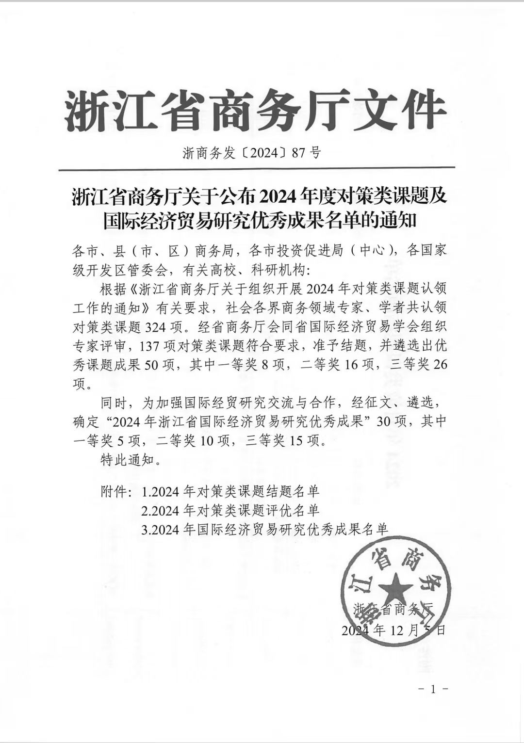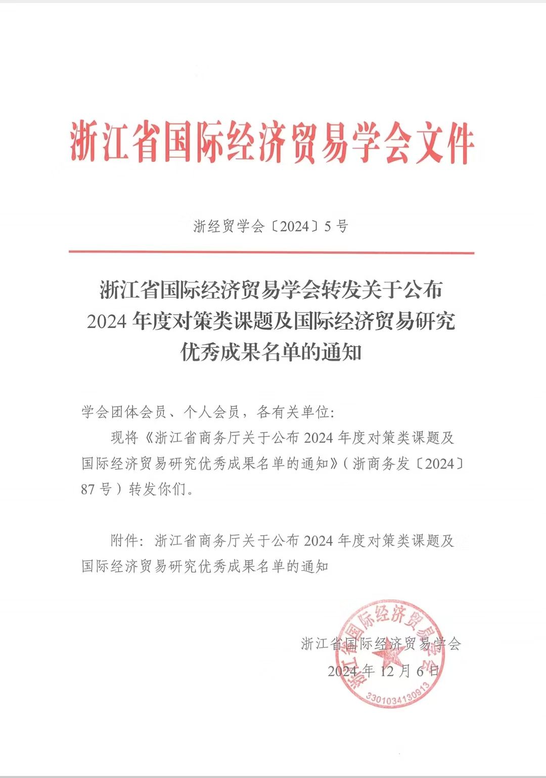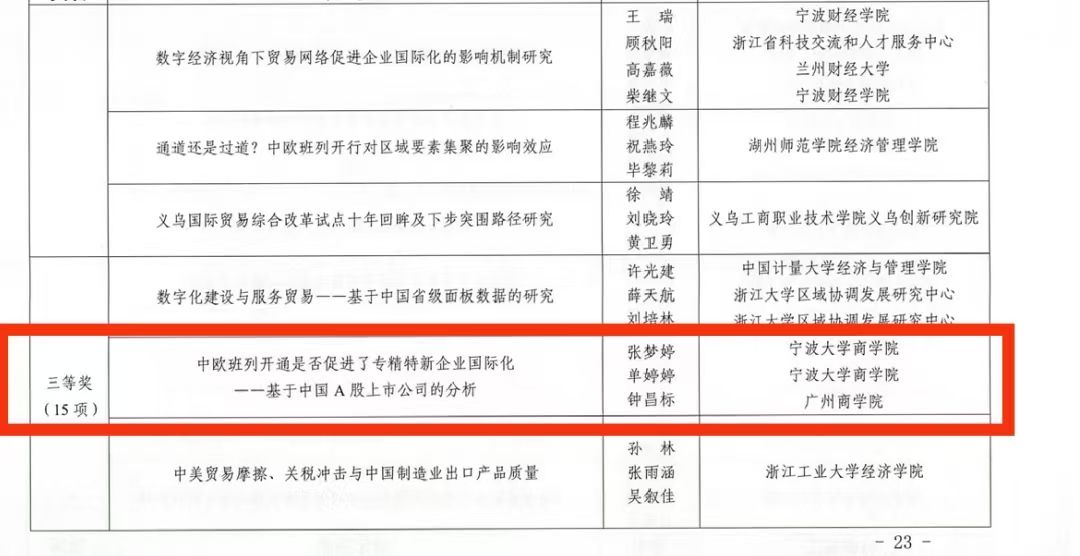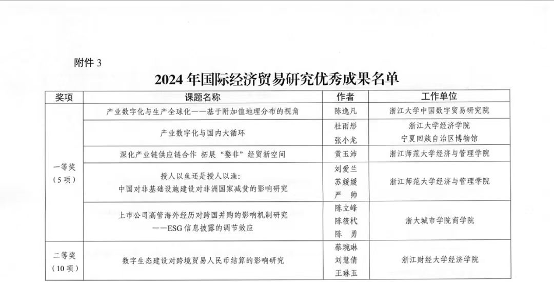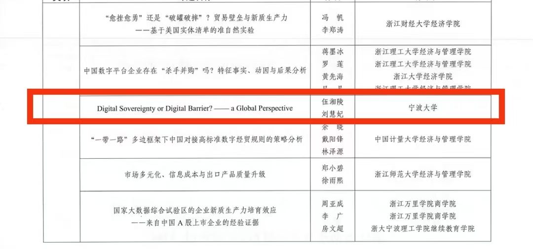 在12月7日本次论坛开幕式上,浙江省商务厅综合处副处长朱德超宣布了2024年度浙江省商务厅对策类课题优秀成果和第十六届浙江省国际经济贸易研究优秀成果名单。我校MIB学位点伍湘陵老师的论文《Digital Sovereignty or Digital Barriers?--a Global Perspective》获评二等奖,张梦婷老师的论文《中欧班列开通是否促进了专精特新企业国际化--基于中国A股上市公司的分析》获评三等奖。