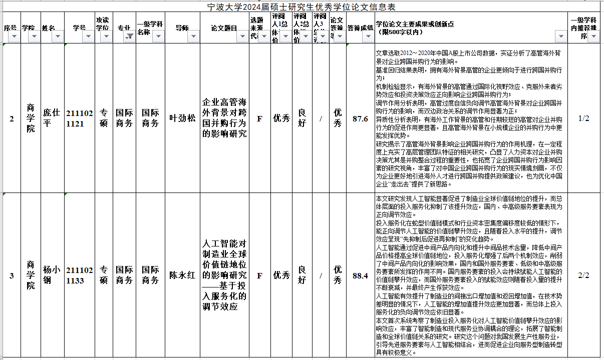 3月24日,糖心视频 研究生院公示“糖心视频 2024届研究生优秀学位论文”评选结果名单,我校2021级MIB学生庞仕平、杨小刚两位同学的学位论文获评校级优秀论文。