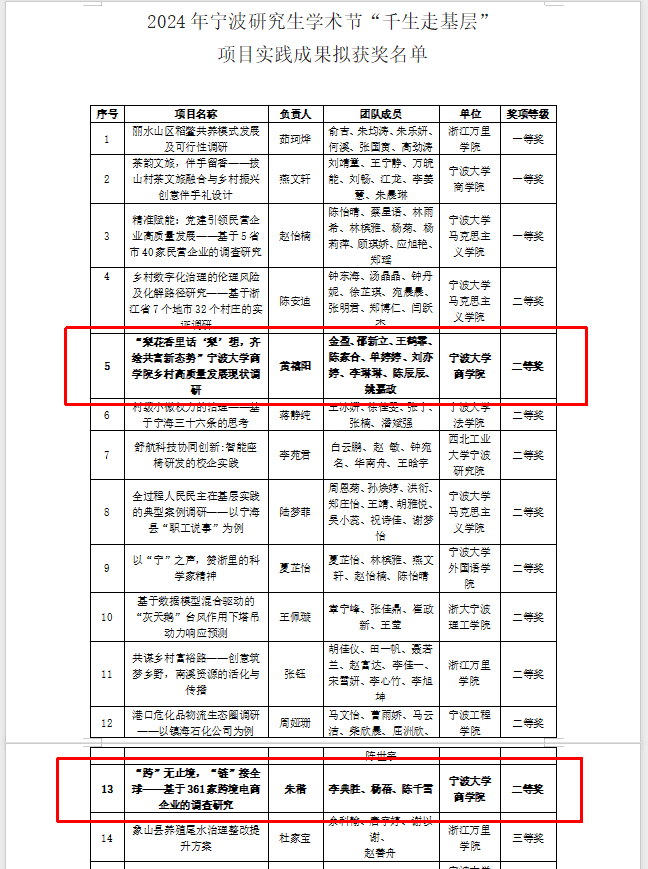 2024年12月31日,宁波研究生学术节组委会办公室发表“2024年宁波研究生学术节‘千生走基层’行动实践成果奖项评比结果”公示。经宁波研究生学术节组委会办公室组织通讯评审、现场答辩、专家评议,26个研究生团队的实践成果拟获得“千生走基层”项目团体一等奖、二等奖、三等奖。其中,2023级MIB朱楷、李典胜和杨蓓团队获评二等奖,2023级MIB邵新立、2022级MIB王鹤霏、2023级MIB陈家合、单婷婷、刘亦婷参加的团队获评二等奖。特此祝贺!
