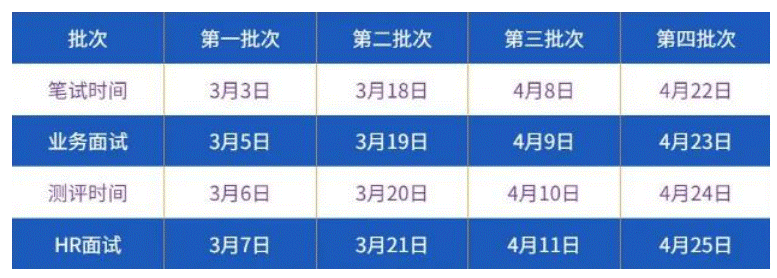 招聘流程:网申-空宣-在线笔试-在线业务面试-在线测评-在线 HR 面试-Offer