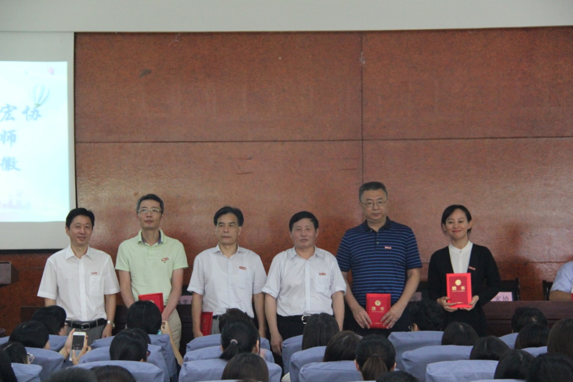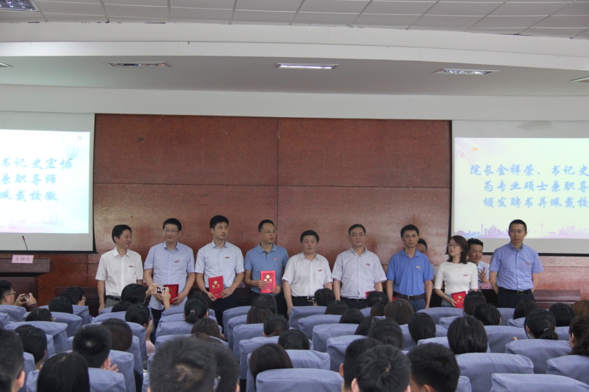 党委书记史宏协宣读2019年糖心视频 新聘的62名专业硕士兼职导师名单,并和金院长一起,为21名到场的专业硕士兼职导师代表颁发聘书,佩戴校徽。