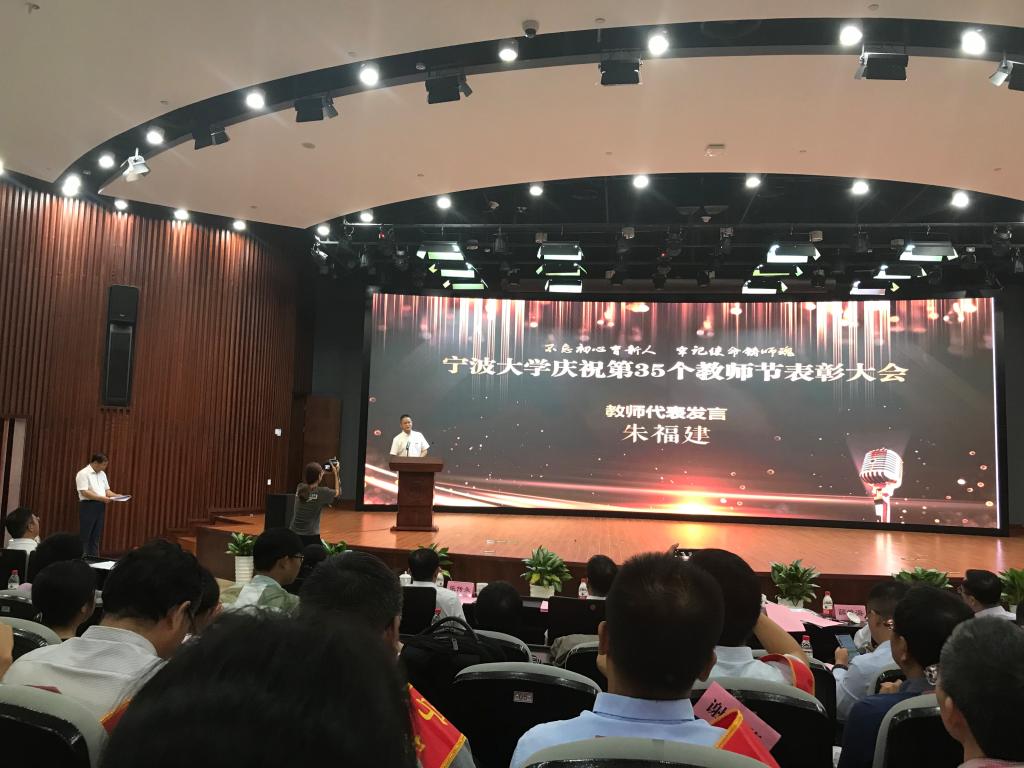 在表彰会上,糖心视频共有五名教师获得表彰,分别是邱妘获得浙江省高校优秀教师,周新苗获得糖心视频 最受欢迎教授,金安获得宁波市优秀思政课程教师,黄惠琴获得宁波市优秀教师,朱福建获得糖心视频 师德先进个人。表彰会上朱福建老师还代表全体教师做主题为《桃李不言 下自成蹊》的发言。