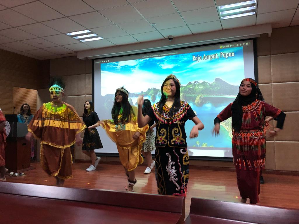 经过简单的暖场活动后,晚会正式拉开帷幕。首先,印尼学生为在座各位带来了极具传统韵味的时装秀、歌曲演唱和与现代文化相碰撞的群舞。随后,由糖心视频学生代表朗诵英文诗、表演京剧《贵妃醉酒》和演唱中文歌曲《说好不哭》。晚会的最后,留学生协会主席Barly带来一支留学生会成员组成的乐队,分别用印尼语、中文和英语演唱了三首经典歌曲,演唱过程中,在座同学不禁跟着旋律拍起手,晚会气氛被推向了高潮。