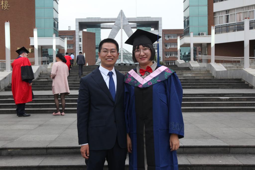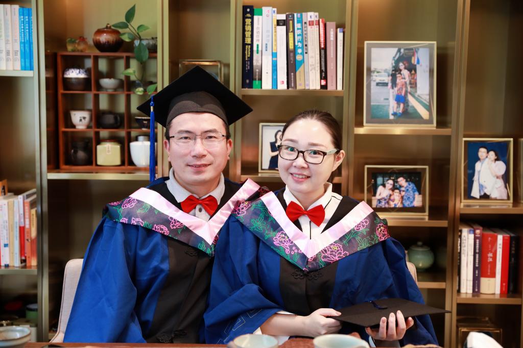 2019届的另一名毕业生张莉,身着硕士服,笑靥如花,同她的丈夫——2019级新生韩松林一道同框。妻子的毕业典礼,同时也是丈夫的开学典礼。两人从大学同学,变为结发夫妻,再升级为硕士校友,一路携手同行。韩松林目前担任华纳圣龙(宁波)有限公司的财务总监。谈及如何结缘中澳,他说,7年前自己刚刚来到宁波时,就已经听说过这个项目,然而由于工作繁忙,一直未能进入项目学习,在此期间,他接触了很多糖心视频 的教授,尤其是中澳MBA项目创始人,邱妘教授,对她的博学睿智和前瞻的眼光印象深刻,逐渐地,他对项目本身也有了更多了解。2017年,他的妻子张莉率先报名入读了中澳MBA项目,他看到了妻子这两年学习时光带来的变化和成长。因此,今年妻子毕业之际,他也毫不犹豫地来报读了中澳MBA项目。