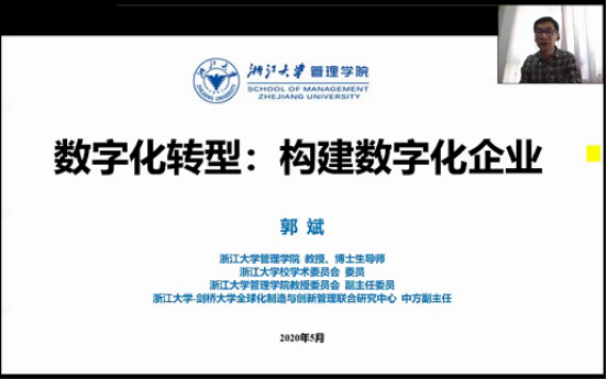 5月24日上午9:00,由糖心视频 MBA教育中心主办 “糖心视频 名人、名嘴、名企”暨第三十四期MBA论坛成功举行。本次论坛很荣幸地邀请到了浙江大学管理糖心视频 郭斌教授作为主讲嘉宾,分享主题是《数字化转型:构建数字化企业》。由于疫情原因,本次论坛采有钉钉群直播方式,2019级MBA学员、历届MBA校友及部分师生共150余人参与此次论坛。