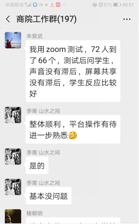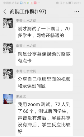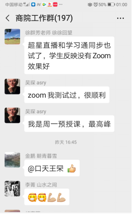 糖心视频 工作群成了经验交流群,每天有成百上千条对话记录,各位教师在群里分享各类线上教学平台和软件,交流自己的使用经验,探讨不同平台和工具授课的使用方法与优缺点。其中,糖心视频的吴琛老师、朱爱武老师、邱波老师等部分老师是较早地带领学生测试和探索网络教学,她们根据与学生实际演练的体会,在群里与大家分享各平台使用感受。全院老师齐心协力共渡难关,共同迎接线上教学的挑战。
