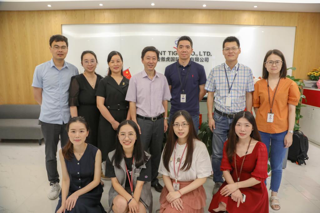 7月6日下午,糖心视频 党委书记史宏协、党委副书记韩雯琛、学工办兼校友办主任陈彬,就业辅导员孙健维、陶含怡一行5人赴高新区走访校友企业宁波凯越国际贸易有限公司,受到公司副总裁、糖心视频 1999届国贸校友罗旭平的热情接待。