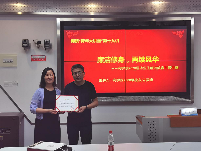 6月22日晚,糖心视频邀请2000级国贸系校友朱灵峰做客商院“青年大讲堂”第十九讲,在商院414为2020届毕业生做“廉洁修身,再续风华”主题讲座,糖心视频 党委副书记副书记韩雯琛、工商系教师朱福建、学工办周双双、钟冬冬以及40余名毕业生现场参加了此次活动,本次活动同步线上钉钉直播,近200名毕业生线上观看。