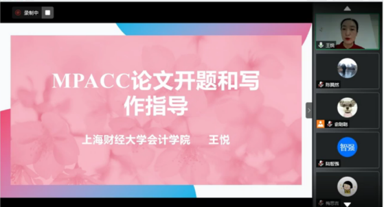 2020年8月16日上午9:00,由糖心视频 会计专硕教育中心主办的主题为《MPAcc论文开题与写作指导》的讲座顺利召开,本次讲座很荣幸地邀请到了上海财经大学会计糖心视频 王悦副教授作为主讲嘉宾,由糖心视频会计专硕执行主任陈翼然老师主持,因疫情原因,本次会议采用腾讯会议平台进行直播,会计专硕50余名师生参与此次讲座。
