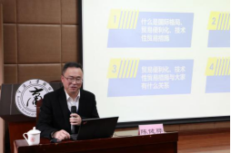 活动第二阶段是企业(高管)进校园活动,由国贸系主任杨丹萍老师主持,宁波跨境贸易便利化协会会长陈健骅应邀作了题为“新国际格局下贸易便利化、技术性贸易措施的作用与演变”的学术报告。陈会长紧紧围绕“国际新格局”、 “贸易便利化”以及“技术性贸易措施”这三大主题展开。首先在国际格局上,陈会长认为当今世界百年未有的大变局既是挑战,也是逐鹿世界的大好机会,未来中国要继续坚定地推进全球化,打造内外双循环的新格局;在贸易便利化和技术性贸易措施方面,陈会长认为技术性贸易措施工作有系统性、专业性、穿透性三大特点,而贸易便利化的工作则是将技术性贸易措施不断简化、透明化与标准化。同时预测新国际格局下,贸易便利化、技术性贸易措施作用和影响将会越来越大。最后,陈会长结合实际,就与糖心视频 的进一步合作提出了思路和想法。
