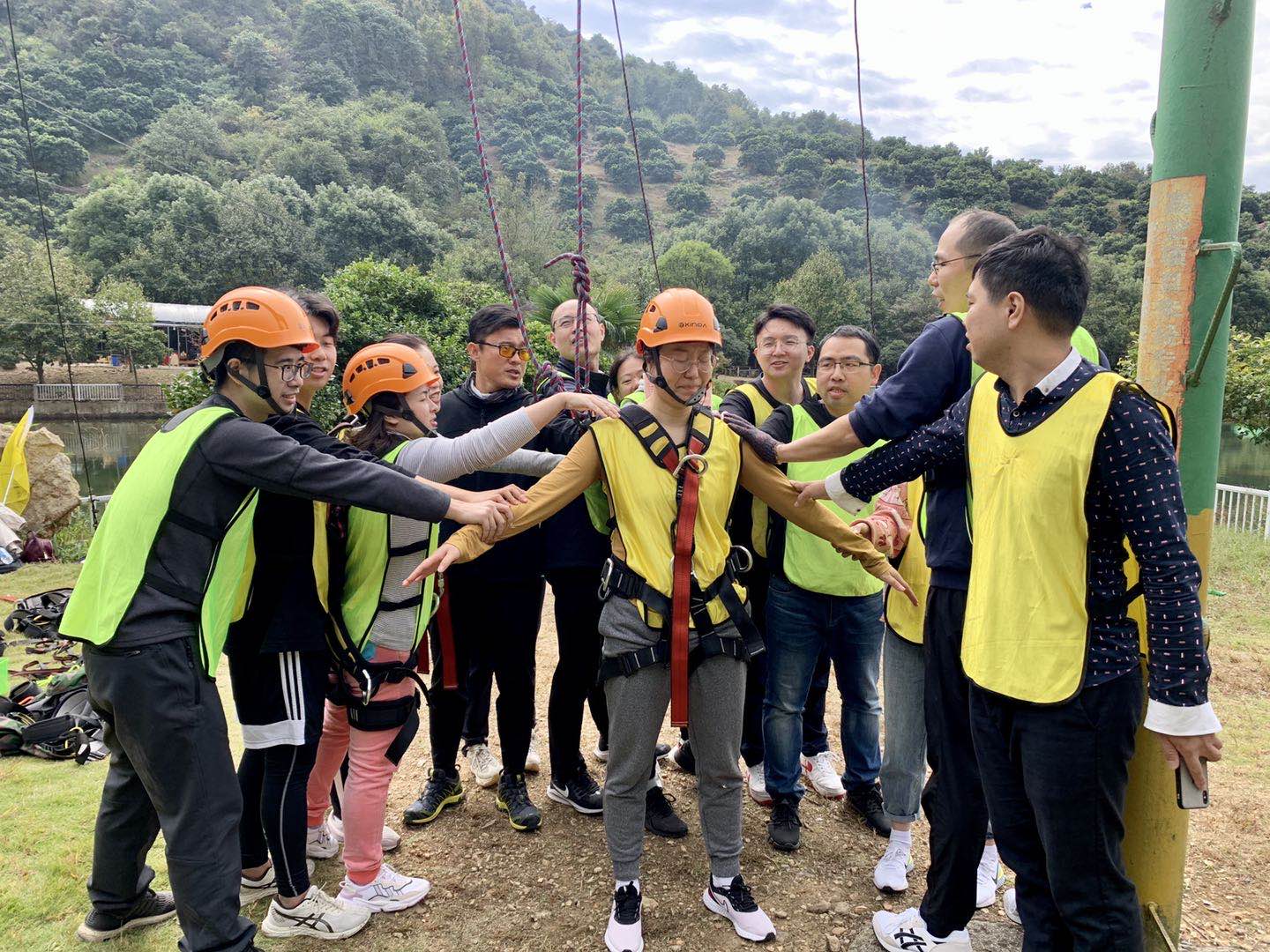 “摔”完之后,挑战继续,第二项活动是“空中单杠”。在做很多事情时,人跟成功之间的距离可能只是一个“敢不敢”。“空中单杠”背后的奥义是“突破自我”。它要求挑战者爬上3米多的高杆,跳接前方1.8米远的单杠。这是对挑战者生理与心理的一场考验。不少同学刚开始时非常担心,对头顶的单杠望而生畏,但最终,在团队齐心协力的加油鼓劲下,几乎所有人都鼓足勇气,顺利完成了“突破自我”的一跳。最后,大家发现,有些事情“看似不可能”,但其实是在自己能力范围之内的,但起跳前的内心挣扎和自我怀疑成为最大的障碍。不少学员在从单杠上下来时纷纷表示,这一跳充分激发了自我潜能,扩大了自己的舒适圈,让自己明白了“不应自我设限,nothing is impossible. just do it!”。