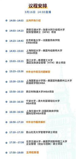 3月16日,由MBAChina专业学位网联合国内多家高校举办的“中外合作项目招生说明会”于线上举行。糖心视频中澳MBA项目也积极参与了本场说明会,向在线180余位师生们介绍了宁大中澳MBA项目的基本情况、培养目标、特色优势和招生政策。在组织方和各高校代表共同努力下,招生说明会取得圆满成功。