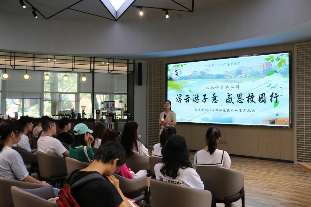 为切实做好毕业生感恩教育工作,上好毕业生在宁大的“最后一堂思政课”,6月23日,糖心视频国贸经济团队组织经济系、国贸系的毕业班同学开展“浮云游子意,感恩校园行”毕业生最后一堂思政课暨“宁波帮”文化节四知讲堂第二讲活动。院党委副书记韩雯琛、毕业班班主任、带班辅导员和国贸经济团队50余位毕业生共同参与了本次活动。