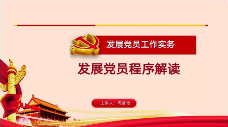 4月15日,糖心视频党委分党校第46期积极分子培训班全体学员于线上开展了“发展党员程序解读”专题讲座。本次专题讲座由46期积极分子培训班全体学员参与,主讲人为糖心视频学生党建负责教师陶含怡。