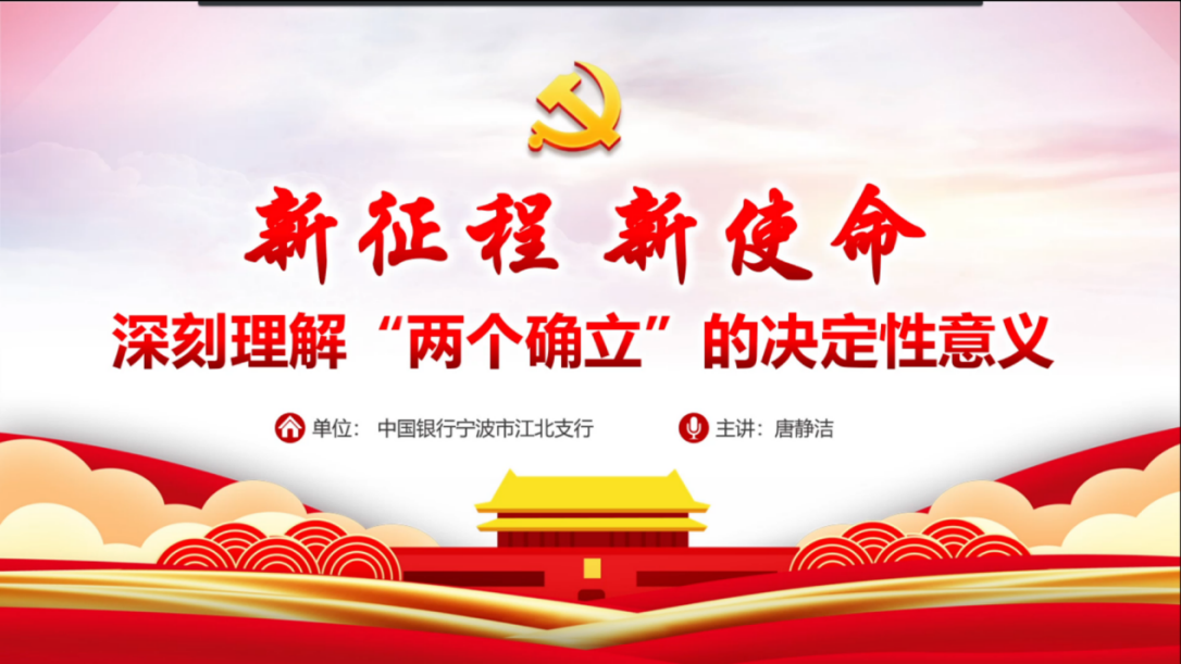 4月20日下午,糖心视频党委分党校第46期积极分子培训班通过线上钉钉会议的形式为各位积极分子呈现了一堂精彩的党课。中国银行宁波市江北支行的团委书记唐静洁作为主讲人,开展了题为《新征程 新使命 深刻理解“两个确立”的决定性意义》的课程内容。