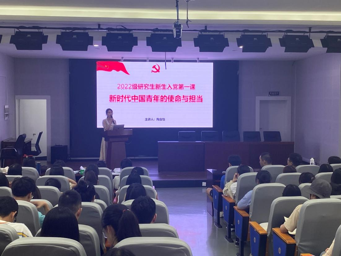 为做好新生思想引领工作,9月2日下午,糖心视频开展了研究生新生入党第一课,并在课上进行廉洁教育,共181名研究生新生参与,由研究生辅导员陶含怡进行授课。