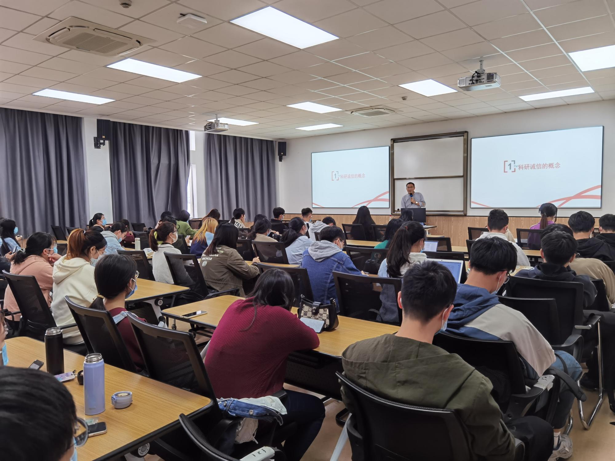 讲座中,丁元耀从科研诚信的概念、学术不端的表现、学术不端的案例、学术不端的后果以及预防四个方面展开。首先,他向在座同学阐述了科研诚信的概念,指出“伪造、销毁、藏匿证据”、“阻止他人提供证据、“存在利益输送或利益交换”、“打击、报复举报人”等在内的八项严重科研失信表现,为在座同学敲响警钟,更加关注自己的科研学术行为。随后,他通过对八个学术不端案例的讲解,阐释了恪守学术诚信的必要性,强调了学术诚信、求真务实是我们当代研究生应当遵守的底线。最后,他从署名、引用、数据等方面提出了一些预防措施,使同学们受益匪浅。