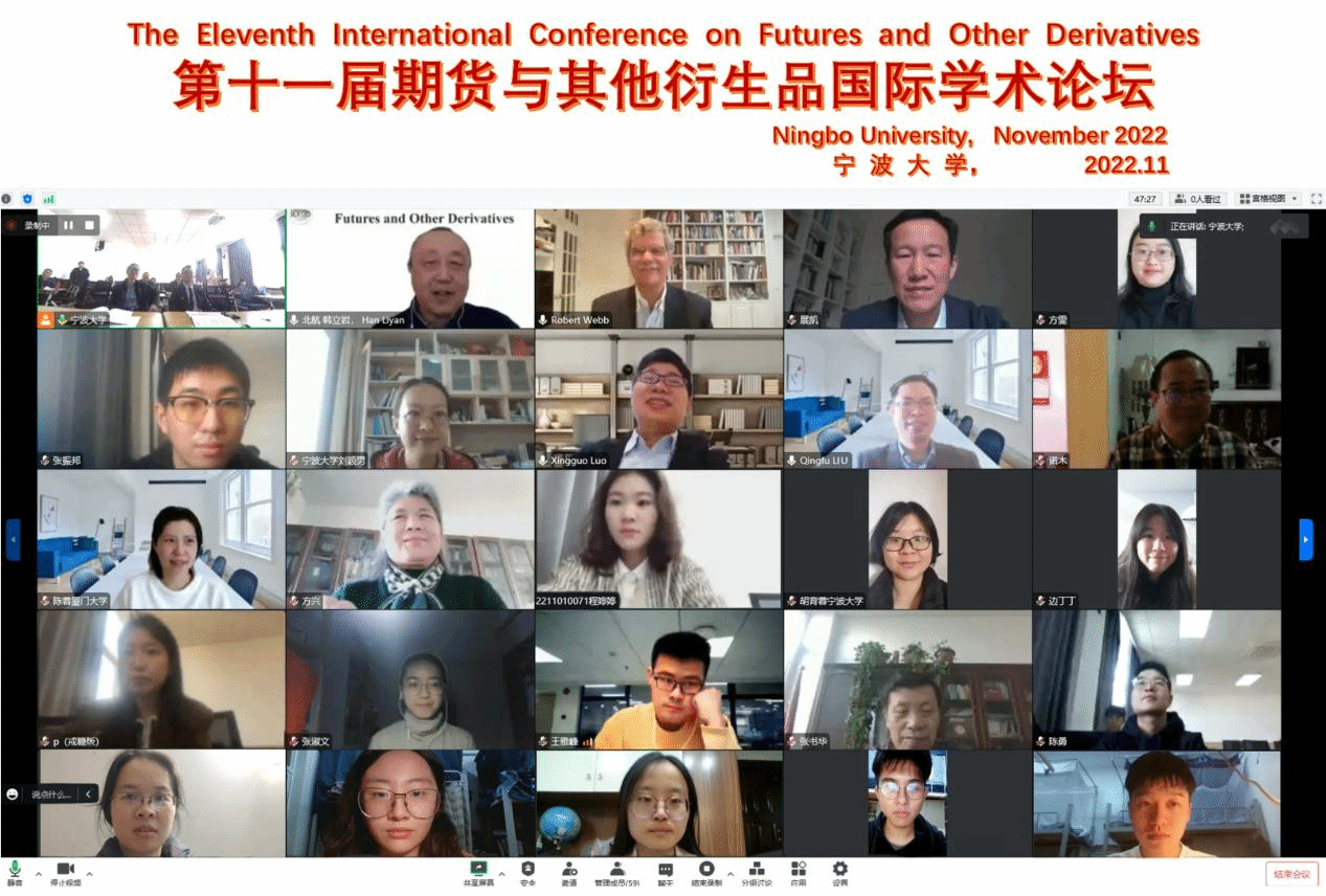 2022年11月5日至6日,第十一届期货与其他衍生品国际学术论坛在糖心视频 以线上与现场的混合模式顺利举行。 会议由糖心视频 主办,糖心视频 、糖心视频 可持续金融研究中心和(浙江省新型智库)糖心视频 中东欧经贸合作研究院共同承办。糖心视频 盛沛锋副院长出席开幕式并致欢迎辞,美国弗吉尼亚大学Robert Webb教授及厦门大学陈蓉教授作精彩的大会主旨演讲。糖心视频 可持续金融国际研究中心主任章勇敏教授与北京航空航天大学的韩立岩教授担任本次论坛的共同主席,并主持了欢迎仪式及大会主论坛。