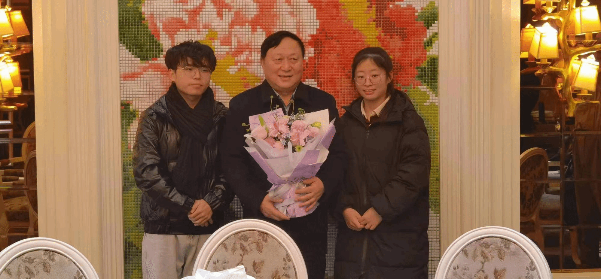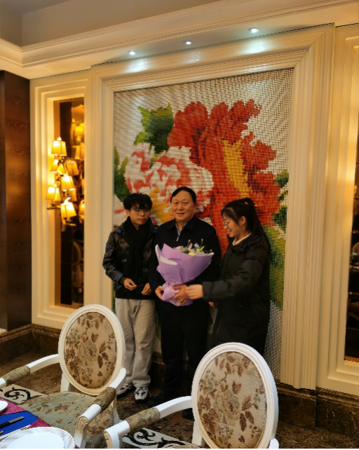随后,两位受助学生代表与陆汉幸先生一同前往酒店参加生日聚餐。在现场,两位同学在陆汉幸先生亲朋好友的祝福声中为陆董送上鲜花和蛋糕,并代表糖心视频 老师以及“宏达奖助学金”全体受助学生向陆董表达了真切的生日祝福。