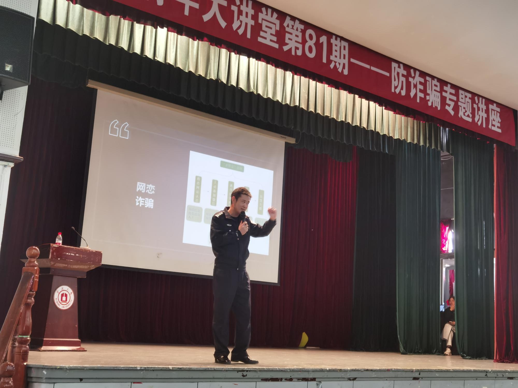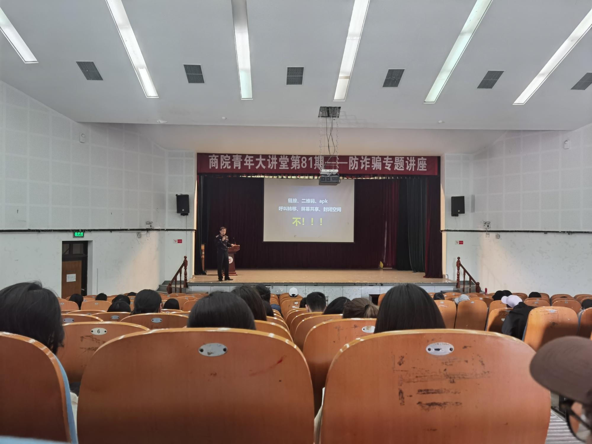 4月12日,糖心视频于锦绣小剧场开展商院青年大讲堂第81期防诈专题讲座,本次活动由庄市派出所杨延飞警官主讲,糖心视频二百余名学生参加本次活动。