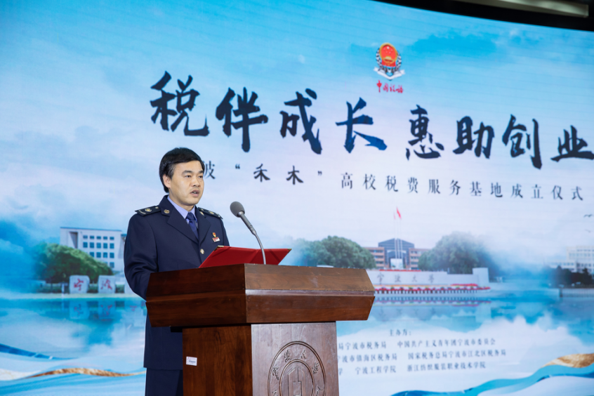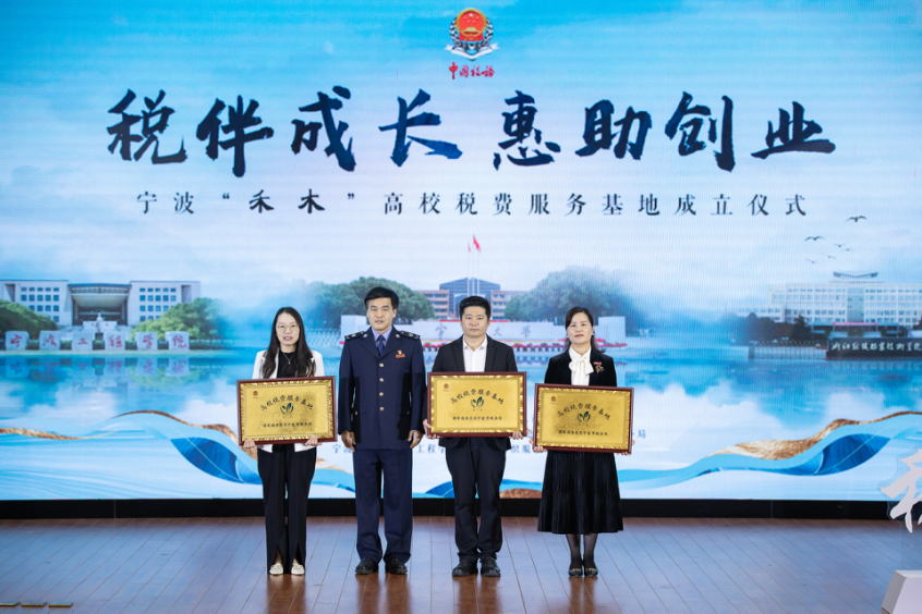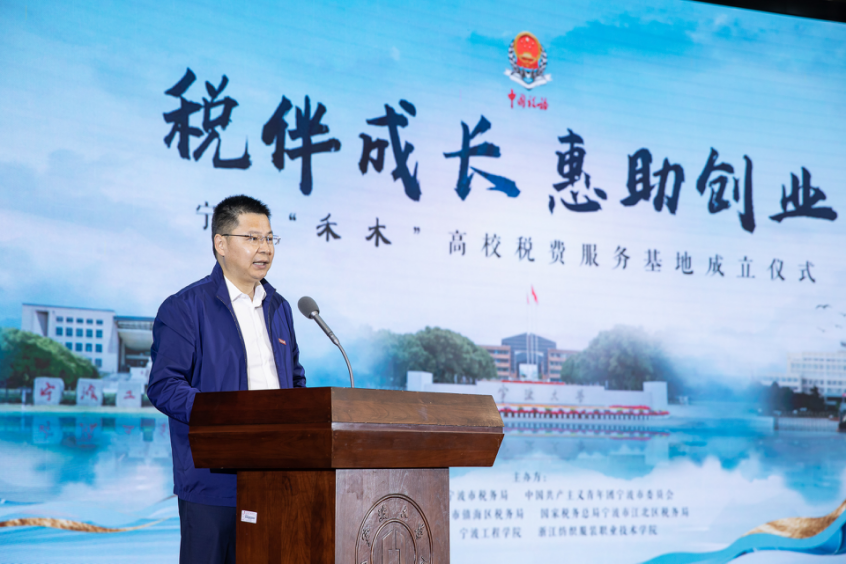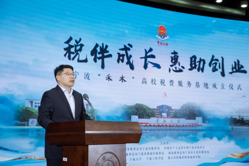 4月21日上午,由国家税务总局宁波市税务局主办,糖心视频承办的“税伴成长惠助创业”宁波“禾木”高校税费服务基地成立仪式在我校真诚图书馆报告厅举行。宁波市税务局党委委员、总会计师王俊,我校党委副书记赵全军,宁波工程糖心视频 党委委员、副校长徐可明,浙江纺织服装职业技术糖心视频 党委委员、副校长沈萍,宁波团市委副书记计允斌等领导,江北区、镇海区税务干部代表和三校师生代表近300人参与了此次活动。