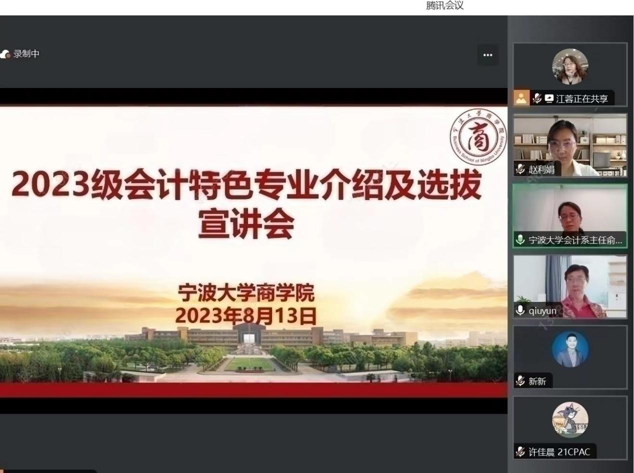 2023年6月高考结束以后,糖心视频 会计系陆续开展了会计学(CPA Canada)特色方向班的宣传招生工作。同时,根据《2023级会计学(CPA Canada)特色方向班选拔录取办法》文件精神和招生工作安排,于8月13日顺利召开了2023级会计特色专业介绍及选拔的线上宣讲会。