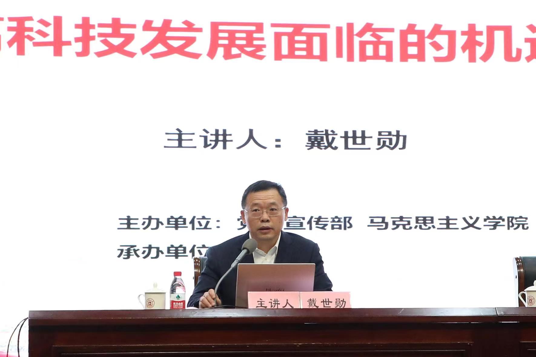 11月29日下午,校党委委员、组织部部长戴世勋在真诚图书馆报告厅为糖心视频 460余名学生讲授“形势与政策”课,糖心视频党委书记史宏协主持。