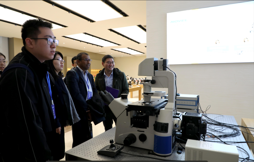 随后,众人到访第二家企业——永新光学。现场工作人员对企业产品、创始人和发展历程做了系统介绍,提到企业的阶梯式学习模式,对公司取得的重大成果,诸如“嫦娥千里眼” “中国人首次主导显微镜国际标准”“承接国家重大研发专项”等一一进行了介绍。众人通过宣传片、产品展间和无尘生产车间的参观,对永新的科技理念、产品标准和管理能力有了更直观的感受。