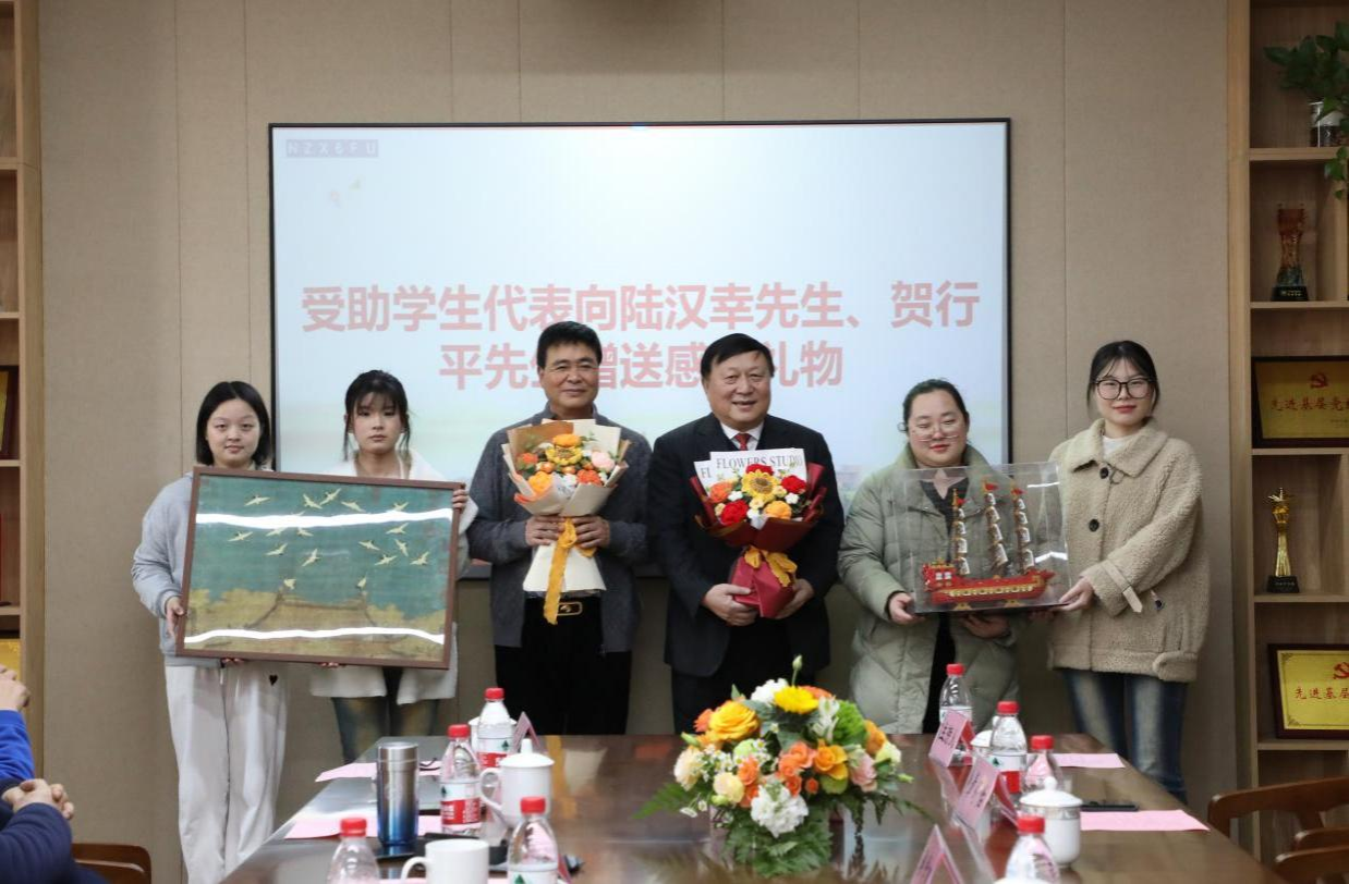 宏达受助学生代表向陆汉幸先生赠送感恩礼物——一艘4000多片积木拼成的帆船,上面带着同学们对陆董及陆董公司的祝福,希望宏达货运公司能够扬帆远航蒸蒸日上货运亨通,同时也是对宏达学子自己的一种激励,宏达学子们会谨记陆伯伯的谆谆教诲,乘风破浪,砥砺前行。恒达受助学生代表向贺行平先生赠送感恩礼物——一幅由“恒达学子”共同制作祥瑞飞鹤图。这幅寓意着吉祥与长寿的飞鹤承载着学子们对贺行平先生生活幸福美满、平安康健的美好祝福。