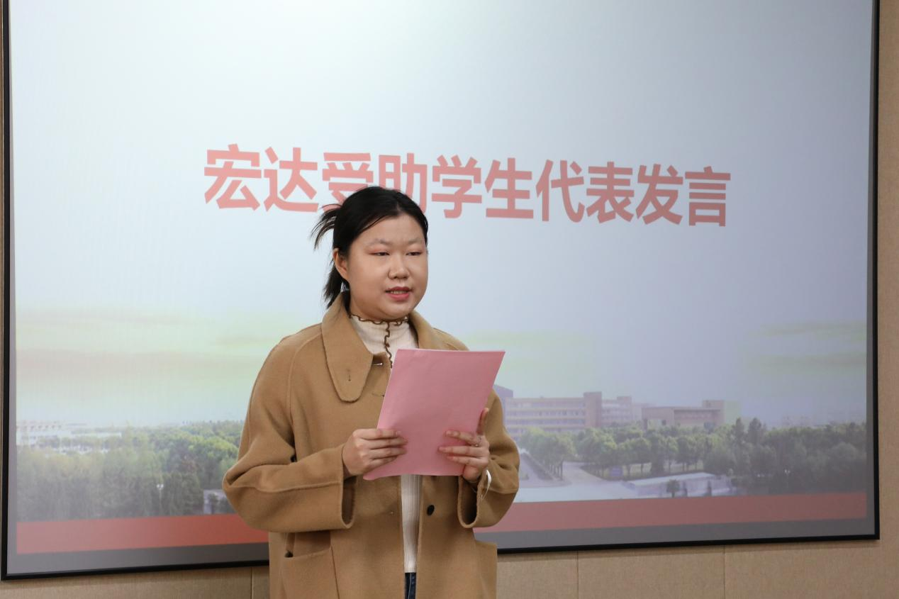 在温情的氛围中,宏达受助学生代表郑艺菲发言,她代表所有获得宏达助学金的同学向陆汉幸先生表达了由衷的感谢。她会铭记陆伯伯说过的话,抛弃后顾之忧,努力拼搏,勤俭节约珍惜手里的每一分钱,坚定自己的理想,以自信的态度,刻苦学习,以德博学,完成学业,把自己磨练品格,为将来更好的回报社会,继续传下去这份善意。