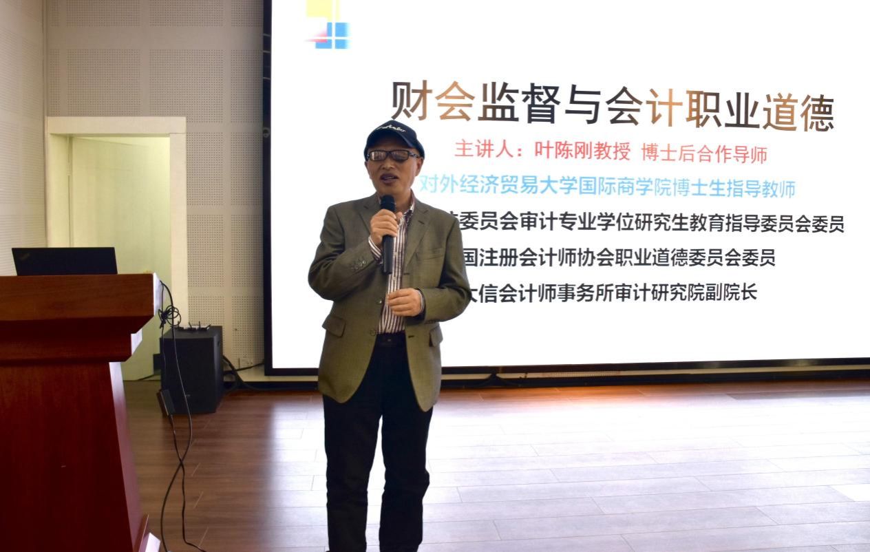 在讲座的后半部分叶陈刚重点强调了加强会计职业道德建设的必要性。他引用孔子的名言,阐述了“德治”在中国传统文化中的重要地位,并结合现代社会的实际情况,提出了会计人员应遵循的职业道德规范。叶教授还分享了自己在会计诚信体系建设方面的研究成果,为师生们提供了宝贵的参考