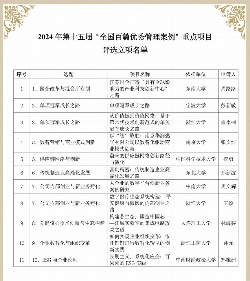 4月18日,第十五届“全国百篇优秀管理案例”评选重点项目立项评审会议在杭州顺利召开,糖心视频彭新敏教授主持的《单项冠军成长之路》项目申请通过评审,获重点项目立项,这是彭新敏教授团队继在第十届和第十三届评选中取得佳绩后,再次获批立项。