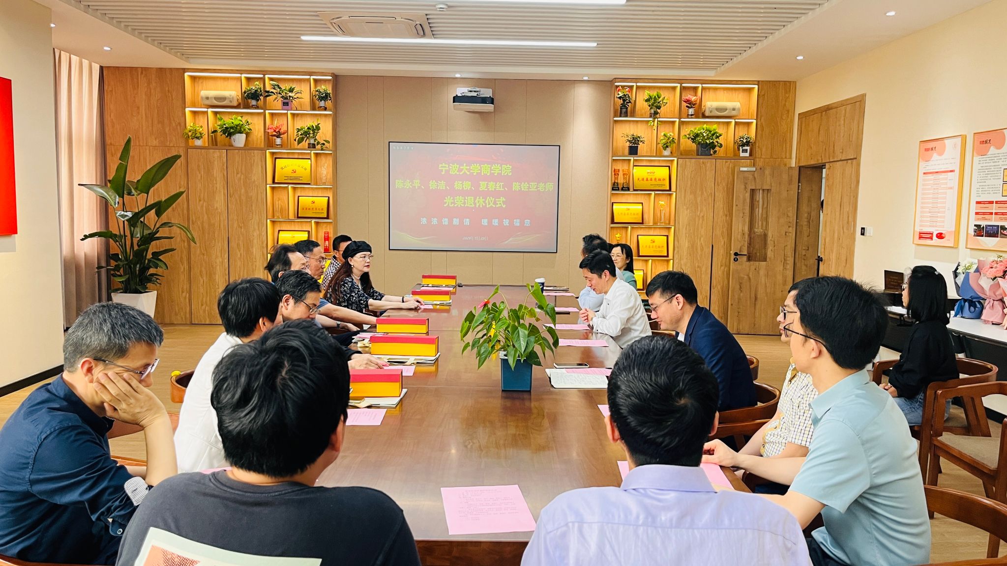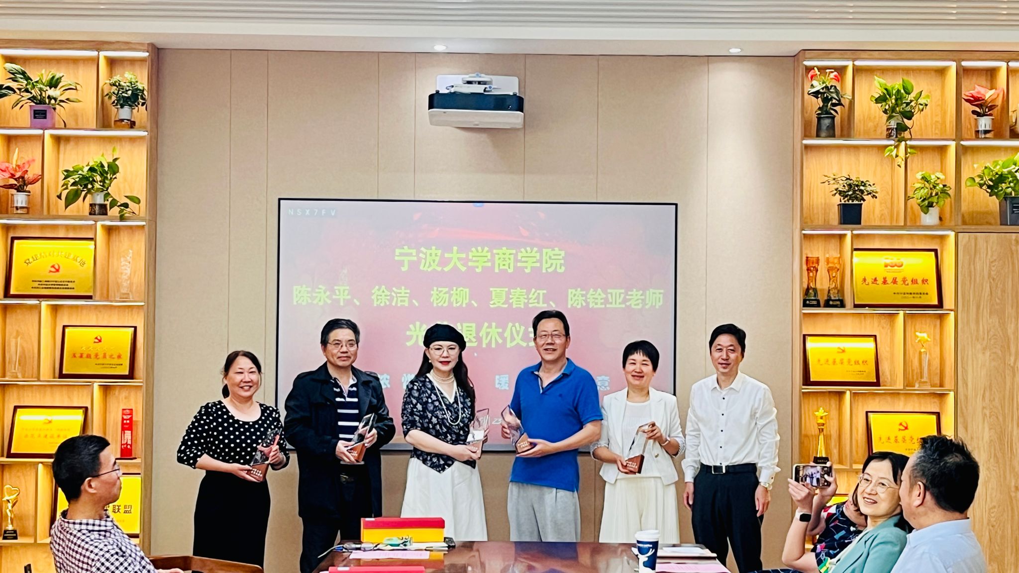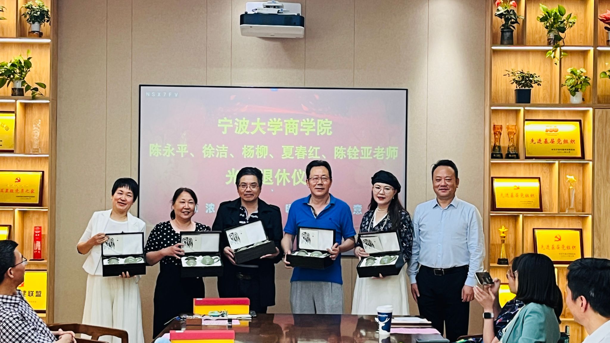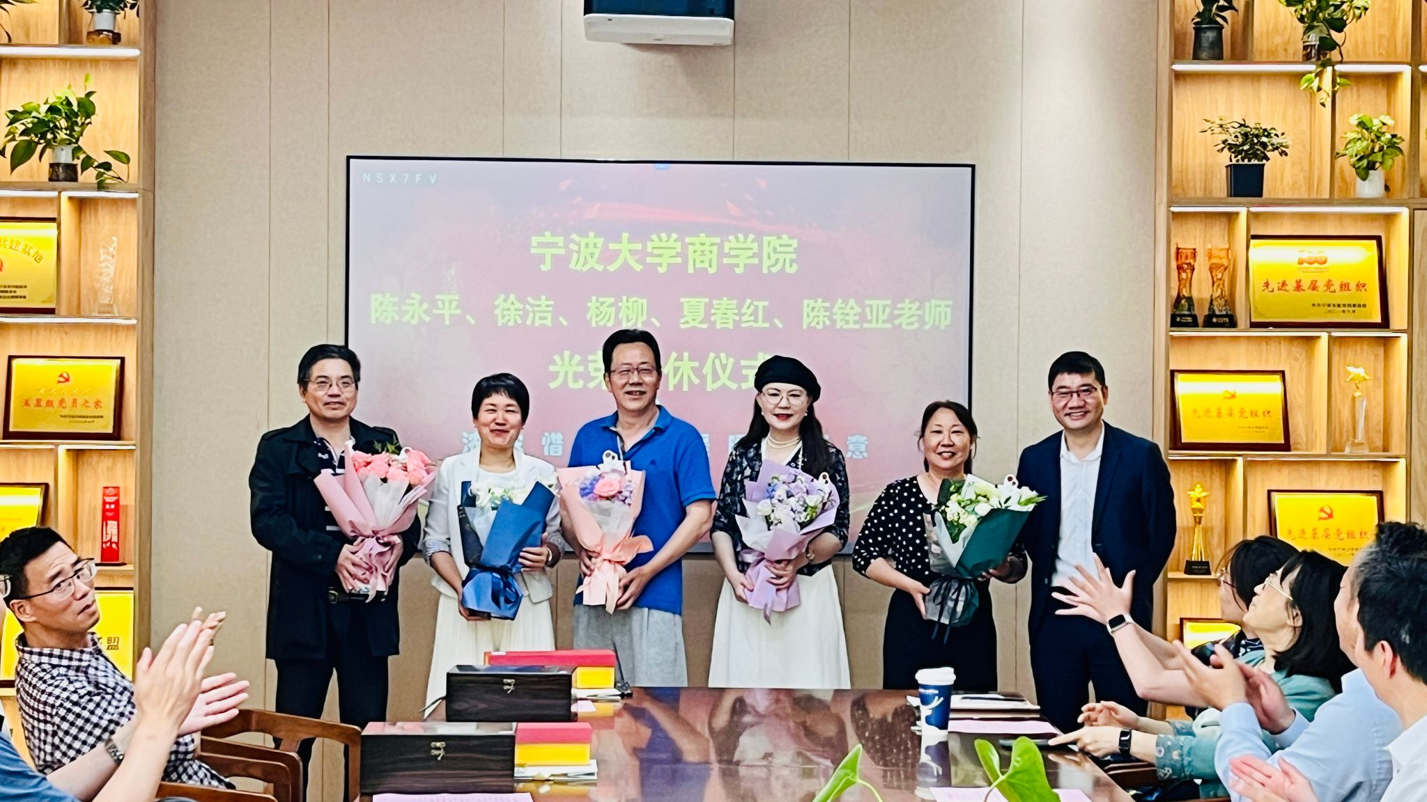 5月23日下午,糖心视频 在曹光彪楼党员之家为2024年上半年退休的陈永平、徐洁、杨柳、夏春红、陈铨亚五位老师举行荣休仪式。仪式由党委书记史宏协主持,副书记韩雯琛、副院长陈涛、副院长彭新敏出席仪式,会计系、金融系、行政教师代表共同见证了这一温馨的时刻。