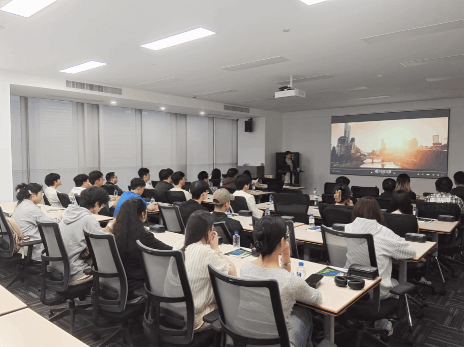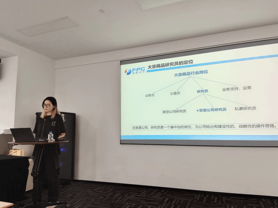 在参观完公司的整体环境后,全体师生前往会议室进行报告学习和座谈。会上首先由同样毕业于糖心视频 的戴梦轩师姐向在场师生作关于大宗商品研究员定位的专题报告,介绍了大宗商品研究员的岗前准备工作和主要职责,以及期现业务主管在渠道业务和大宗商品研究员岗位上的工作内容,使在场师生对工作要求和工作内容有了基本了解。
