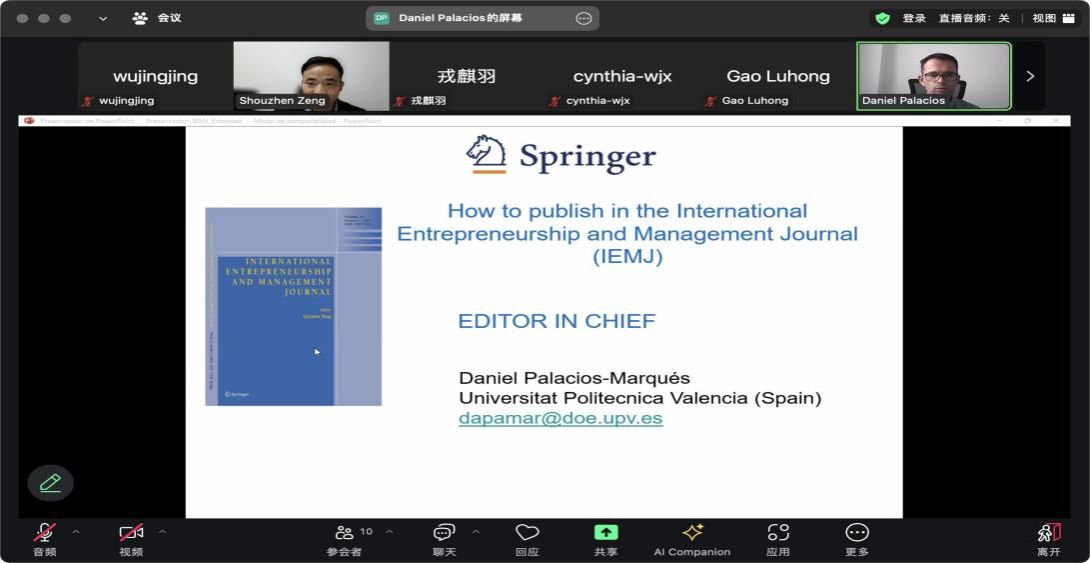 丹尼尔教授围绕“tips to publish in the IEMJ”、“explore journal publication strategies”、“evaluation and selection of target journals”、 “methods for responding to review comments”、“paper evaluation criteria,”、“factors affecting paper quality”等方面展开,详细介绍了创业与管理领域研究的新趋势。