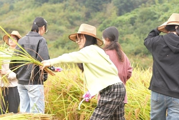 一抵达陶坑农场,成片稻田映入眼帘。师生党员们撸起袖子、拿起镰刀、俯下身子,协助村民收割水稻、抱谷脱粒,在田间不停穿梭忙碌,确保稻谷颗粒归仓,众人齐心协力,干劲十足。