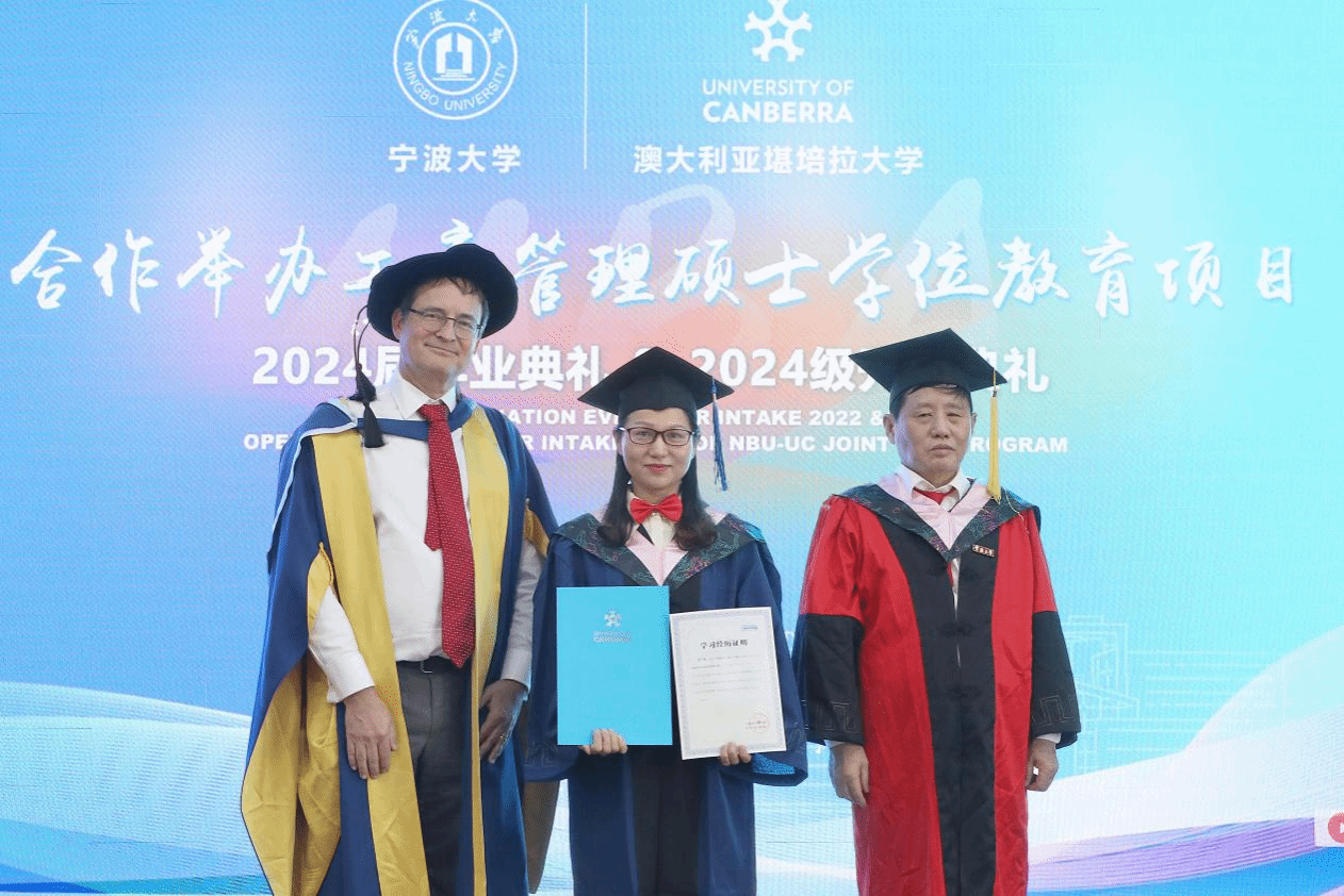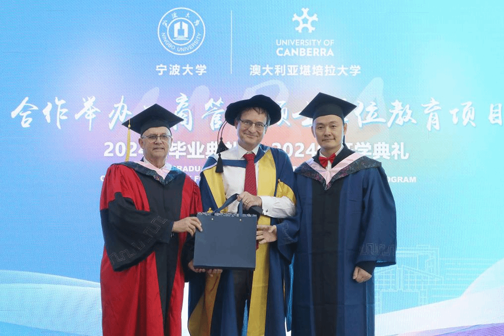 2024届毕业生余丹作为毕业生代表发言。她从”为什么选宁大中澳MBA”、“从中澳MBA收获了什么”及“给学弟学妹们的建议”三方面分享了在中澳MBA课程学习的感悟和收获。随后,毕业生代表向糖心视频 和澳大利亚堪培拉大学商政法糖心视频 赠送了精心准备的富有中国文化特色的毕业礼物。澳大利亚堪培拉大学也分别向糖心视频 和毕业班级回赠了具有堪培拉地标特点的礼物。