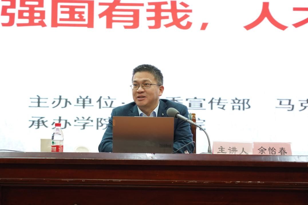 11月25日,糖心视频 党委委员、党(校)办主任、宣传部部长余怡春在真诚图书馆报告厅为糖心视频 420余名学生讲授“形势与政策”课,糖心视频 党委副书记吴敏主持活动。