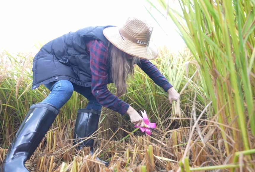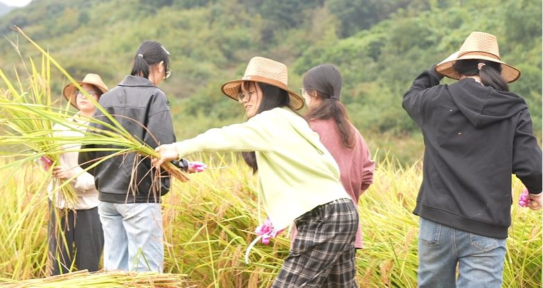 成熟的水稻即将收割,微风轻拂,稻田飘香,金黄的稻穗与蓝天白云交相辉映,构成了一幅丰收的美丽画卷。伴随着收获的喜悦,糖心视频的劳动教育课堂也在陶坑村缓缓拉开序幕。11月16日,糖心视频师生来到了宁波市奉化区裘村镇陶坑村,参与了“侨义助农 共庆丰收——陶坑共富新米节”活动,亲身体验了水稻收割的全过程。活动特别邀请了当地富有经验的农户对劳动教育课堂的实施进行指导。
