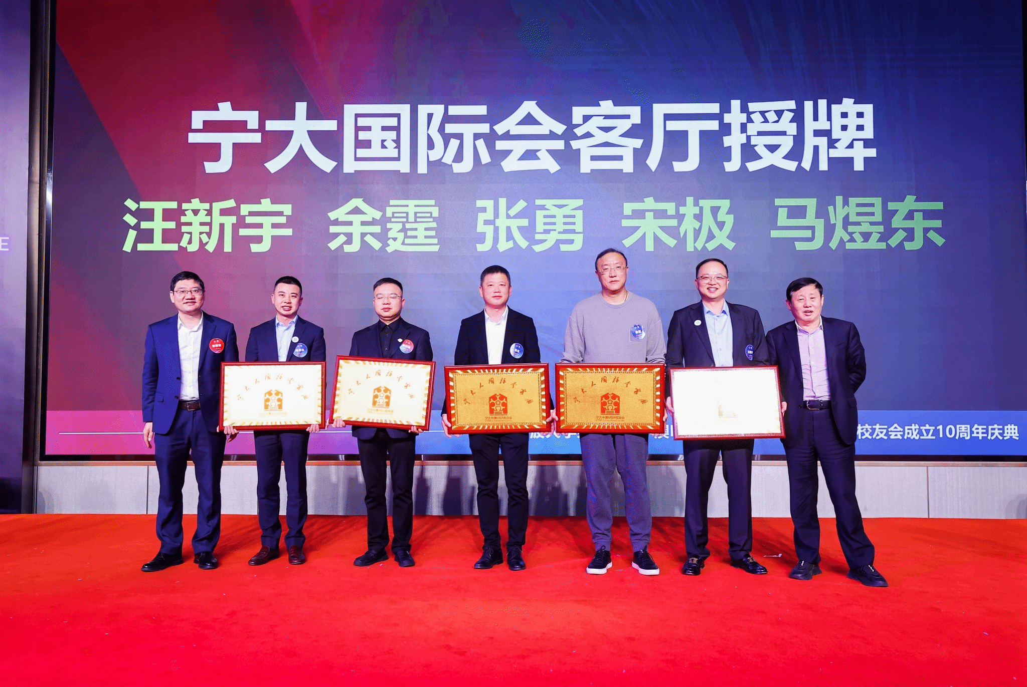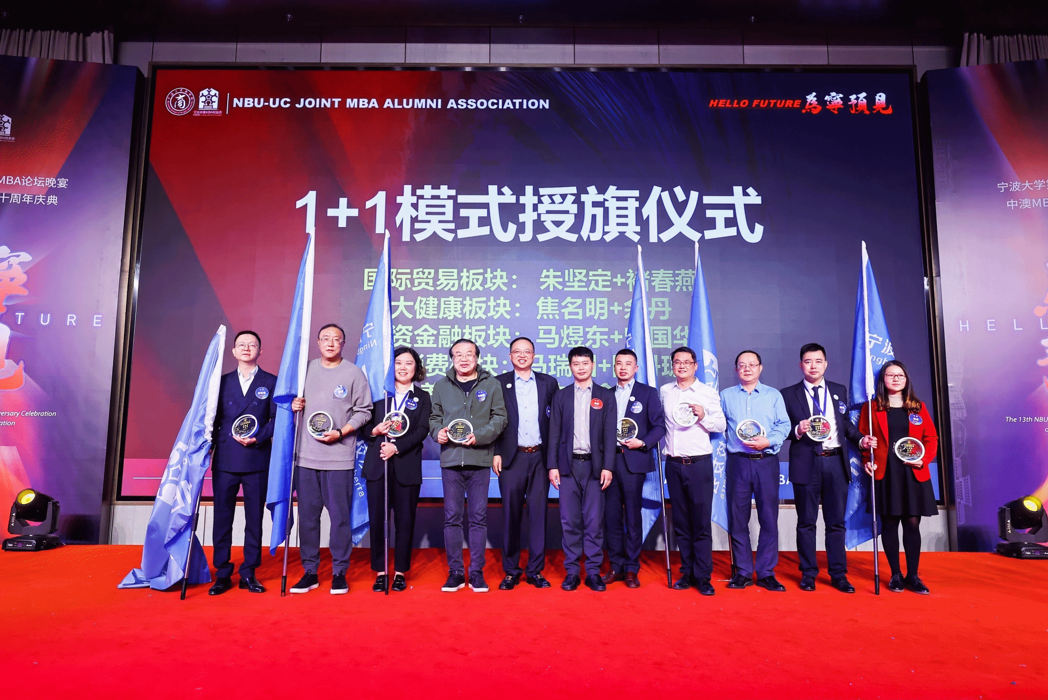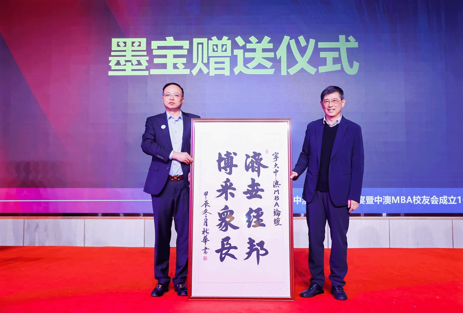 论坛结束后,举办了校友晚宴。糖心视频 校友会会长聂秋华用十个“精”高度评价了此次论坛的举办,并向中澳MBA校友会赠送了亲手书写的墨宝“博采众长,济世经邦”。年会还对为项目建设和校友会发展做出卓著贡献的校友老师和本次活动的赞助单位进行了表彰,颁发了领航奖、伯乐奖、学科建设贡献奖、贡献至尊奖、贡献卓越奖、筹备贡献奖等奖项,并进行了校友会活动“1+1模式授旗仪式”及“宁大国际会客厅”授牌仪式。