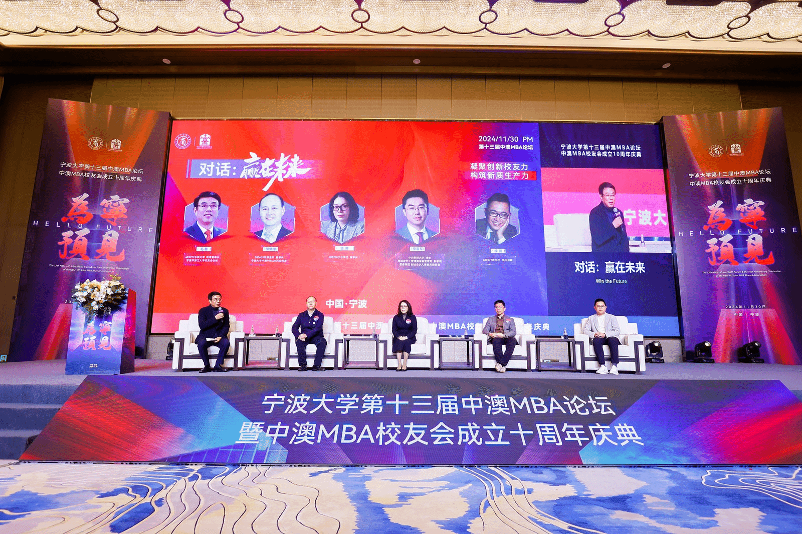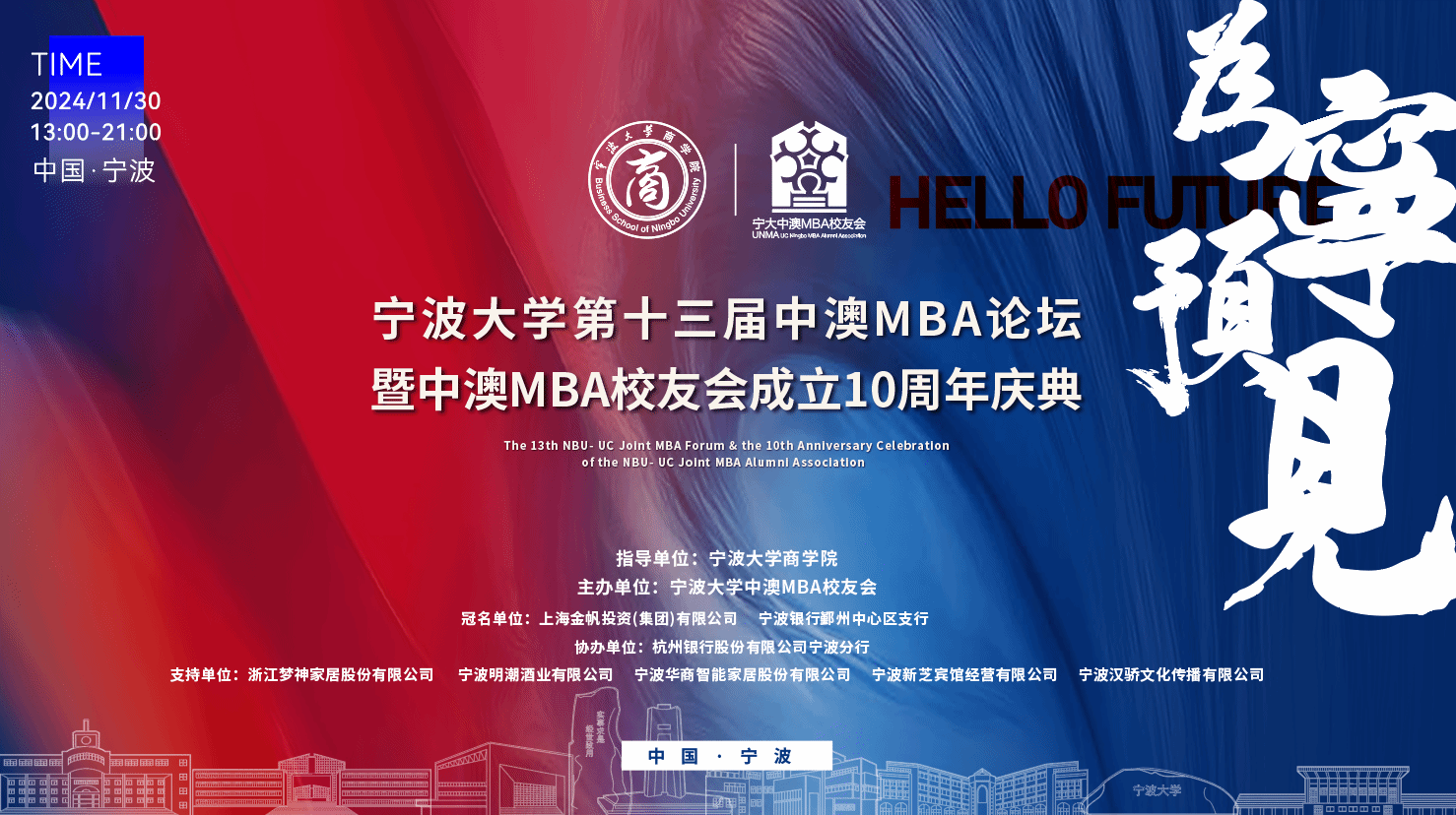 2024年11月30日下午,“为宁预见”糖心视频 第十三届中澳MBA论坛暨中澳MBA校友会成立十周年庆典在宁波新芝宾馆成功举办。本次活动由糖心视频 指导,糖心视频 中澳MBA校友会主办。糖心视频 党委书记朱达、糖心视频 党委副书记张真柱、糖心视频 党委委员兼宣传部长余怡春、糖心视频 校友会会长聂秋华、糖心视频 校友会顾问叶飞帆、糖心视频 校友会副会长冯志敏、糖心视频 校友会副会长兼秘书长胡宝华、永新光学董事长兼宁波市浙大校友会会长毛磊,美康生物董事长、糖心视频 中澳MBA2005级校友邹炳德,宁水集团董事长张琳,原国家外汇管理局储备管理司副总裁、思睿集团创始合伙人兼首席投资官李富军,雅戈尔执行总裁徐鹏等出席本次论坛。论坛由糖心视频 党委书记史宏协主持。活动还特邀了著名经济学家刘煜辉、奥运冠军孙杨,与现场领导、校友及兄弟校友会代表、各界嘉宾等总计400余人欢聚一堂,共同庆祝中澳MBA校友会成立十周年。