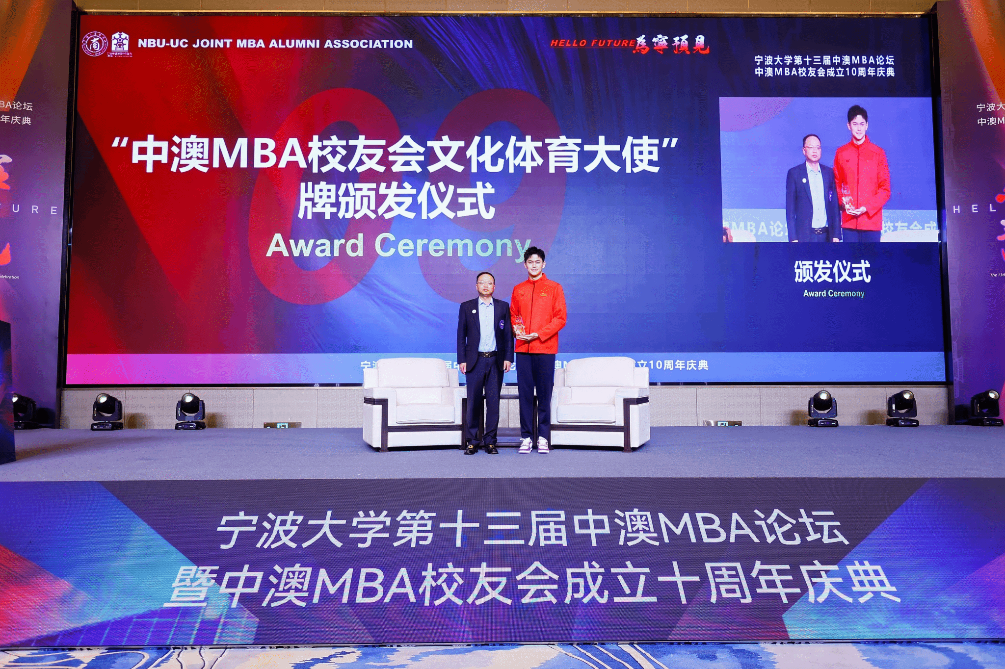 接下来,在现场全体嘉宾和校友们共同见证下,糖心视频 中澳MBA校友会会长汪新宇先生向著名游泳健将、奥运冠军孙杨先生颁发了“糖心视频 中澳MBA校友会文化体育大使”的表彰牌。随后,糖心视频 党委副书记吴敏主持并邀请孙杨作体育和商业主题分享,与众人共同探讨体育在推动经济增长、促进社会进步方面的多维度价值。他首先结合宁波本地制造业、外贸产业发达,GDP发展迅速的特点,认为糖心视频 具有人才储备充足的优势,期待与校友们共同在体育事业方面创造更多就业机会。接下来,他以大型体育赛事的经济影响为切入点,探讨奥运会、世界杯等赛事如何推动举办地的经济增长,提出要利用好赛后场馆,实现运营化、数字化、科学化管理。实现传统体育破圈,让体育产业走进学校,拓宽未来发展空间,实现体育事业的智能迭代。最后,他讲述了自己今后的计划是走进校园、开展体育活动,同时类比企业和体育竞技,都要秉承奥运精神,突破困难,穿越周期。吴敏副书记也祝愿今后糖心视频 能与孙杨先生有更多深度的合作。